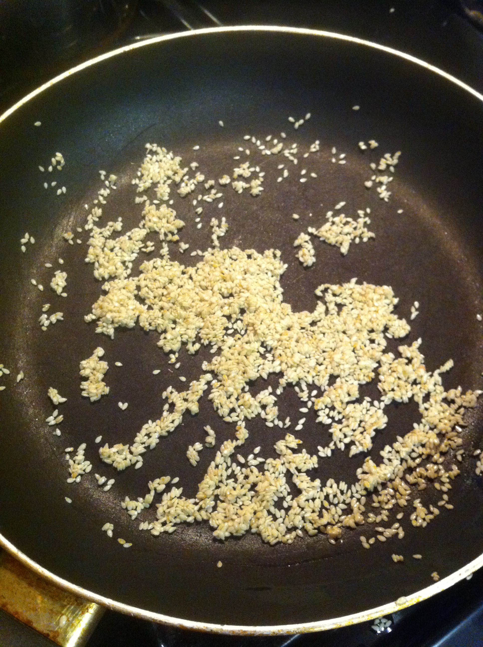 1. Toast the Sesame seeds according to the back of the jar- in an ungreased pan for a few minutes. NOTE- I read the directions quickly and thought they said “heavily greased pan” when in fact they said “heavy ungreased pan“… bad move, but luckily I caught it before it was too late!