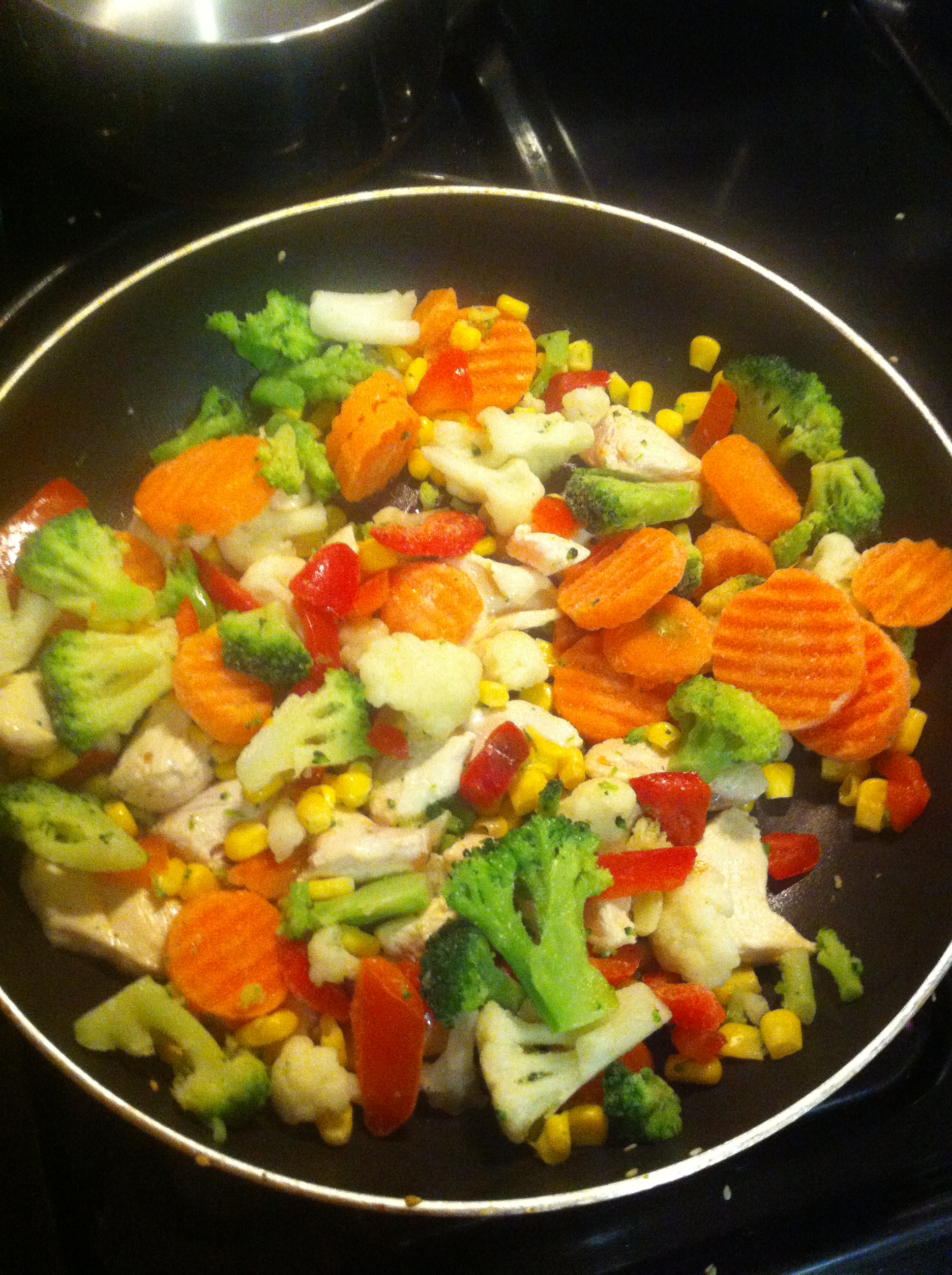2. Remove the toasted Sesame seeds from the pan and add the chicken to that same pan. I cut mine into 1 inch cubes. When the chicken is almost cooked all the way through, add the bag of frozen veggies to that same pan and turn the heat on low so that the veggies thaw and cook.