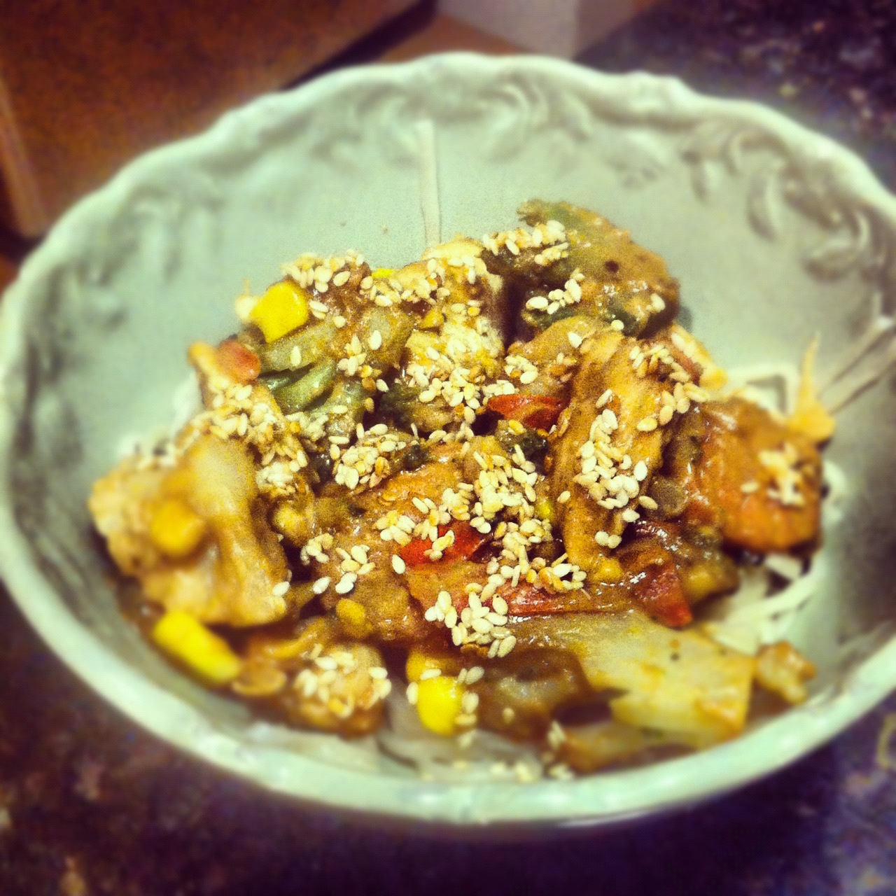 Once the chicken and veggies are cooked, add the peanut sauce and stir well so that everything is coated. Drain the noodles and place a serving of them into a bowl, top with the chicken/veggies/peanut sauce and sprinkle some toasted Sesame seeds on top.