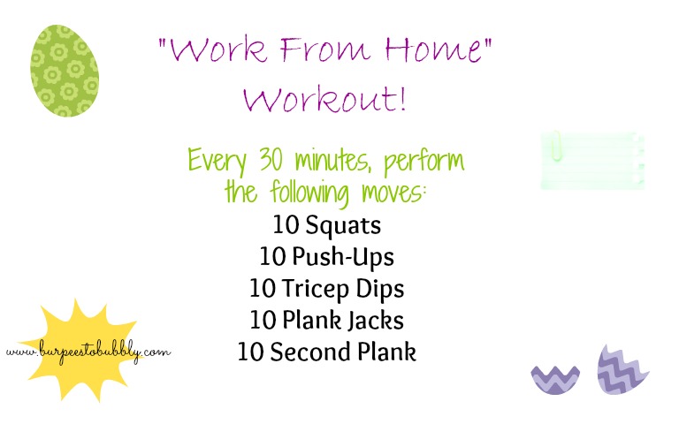 • Monday (today)- I have extra free time today since I am not commuting to and from work, so I am doing my “WFH” Workout: