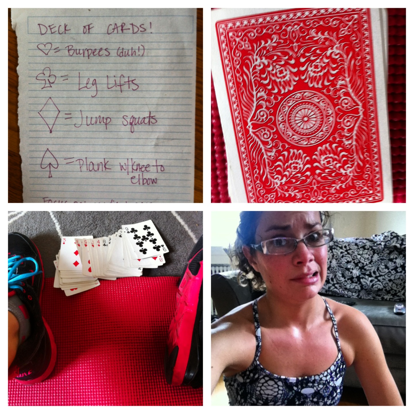 Last time I checked in with you, I was debating on what to do for a workout. I wasn’t feeling great and had had a couple of intense workouts earlier in the week. I thought about just walking or doing nothing, but when Athena suggested that I do the “Deck of Cards” workout (originated by Bob Harper- google it), I was totally peer pressured. I had wanted to do this workout for a while, so I figured that Friday was the best day to do it.