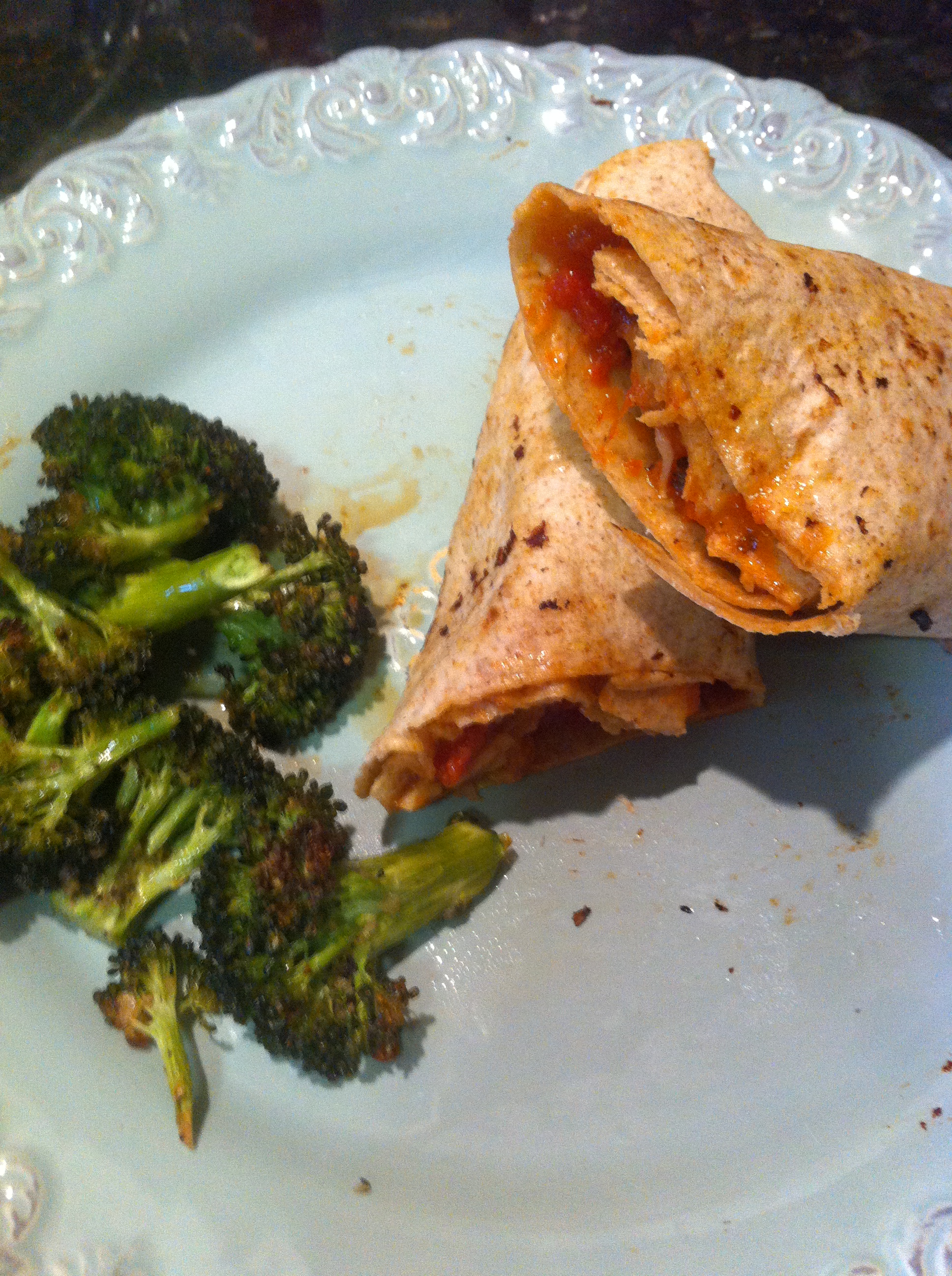 Yum. Definitely a fun thing to eat on a Saturday night. I made the roasted broccoli by coating the florets with a little bit of EVOO, Sea Salt and Pepper, Garlic Seasoning and Mrs. Dash- we baked them for about 15-20 minutes. Delish!