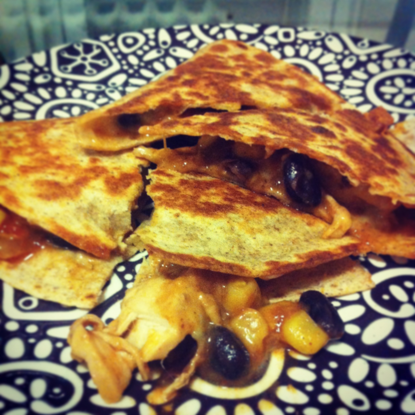 All I did was take the leftover “chili” mixture (it thickened up in the fridge) and put it in a honey wheat tortilla (Fiber One- love them!), added some cheese and grilled it up. Quick, easy, delicious.