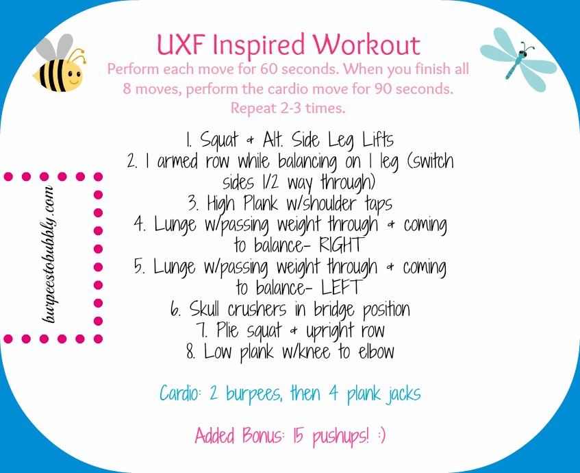 Ok, let’s get to that workout that I promised you, ok? As most of you probably know, I teach a UXF Burn class for the Boston Sports Club once a week. As much as I love the workouts, I get bored quickly and need to change-up the format sometimes. While the basis of the workout is consistent with the “Keep It Moving” format, I changed it up in that we kept the 60 second time intervals for the strength portions throughout the whole workout (instead of dropping them down to 45 seconds, 30 seconds, and then 2 tabata rounds).