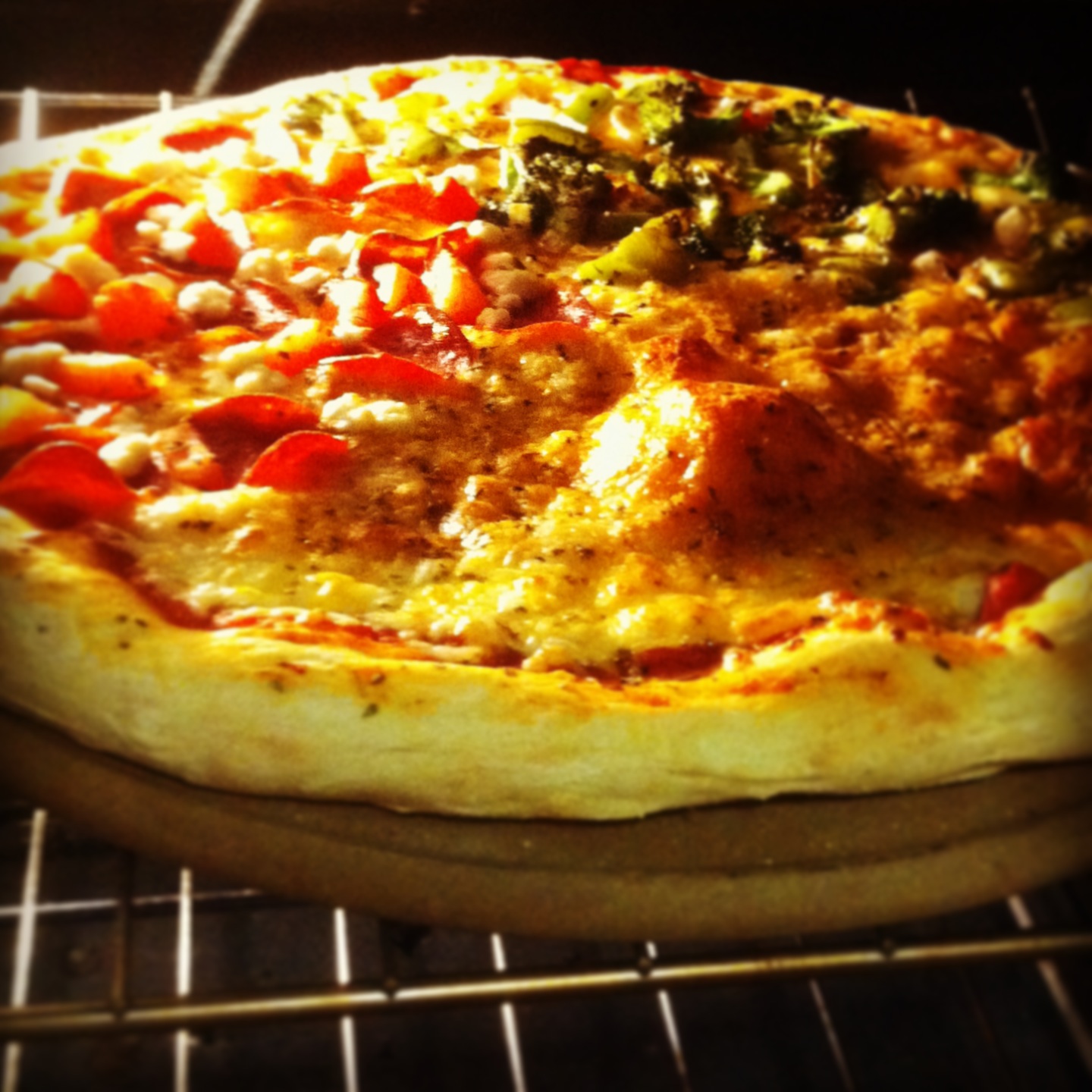 Obviously I had to try a little bit of all 3: turkey pepperoni, fresh tomatoes & goat cheese. peppers, broccoli and onions. plain cheese. Holy Yum!