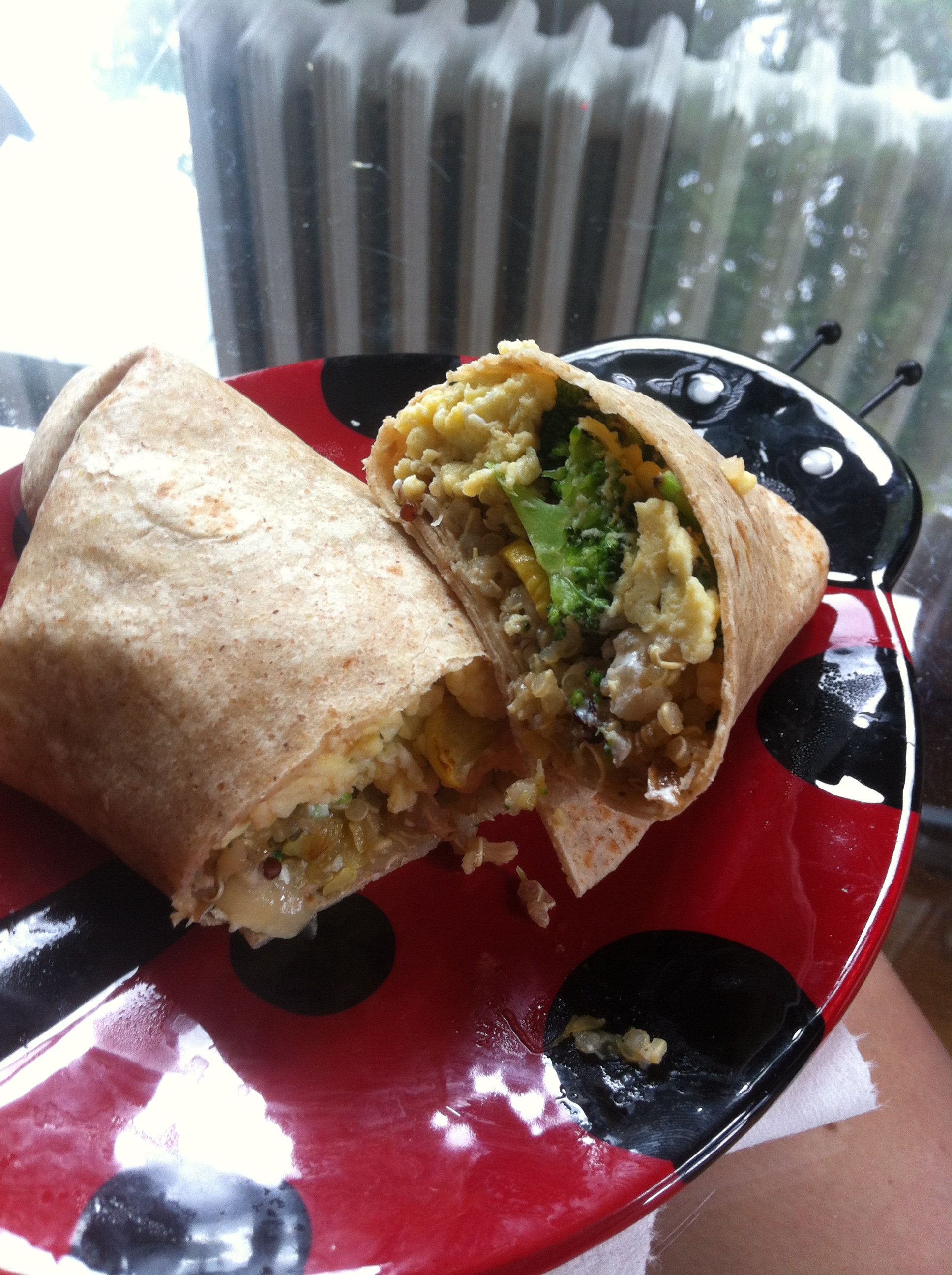 When I got home from kickboxing, I worked in my garden a little bit. I had a few more things I wanted to plant and my dad was nice enough to give me 3 more bags of soil, so it felt good to knock that off of my “to-do” list, while still working on my tan 😉 And, the sun went in just as I was ready to eat lunch. Perfect timing! I sautéed some broccoli and summer squash and then added in an egg, scrambled it up, topped it with goat cheese and served it as a wrap. Easy, healthy, yummy.