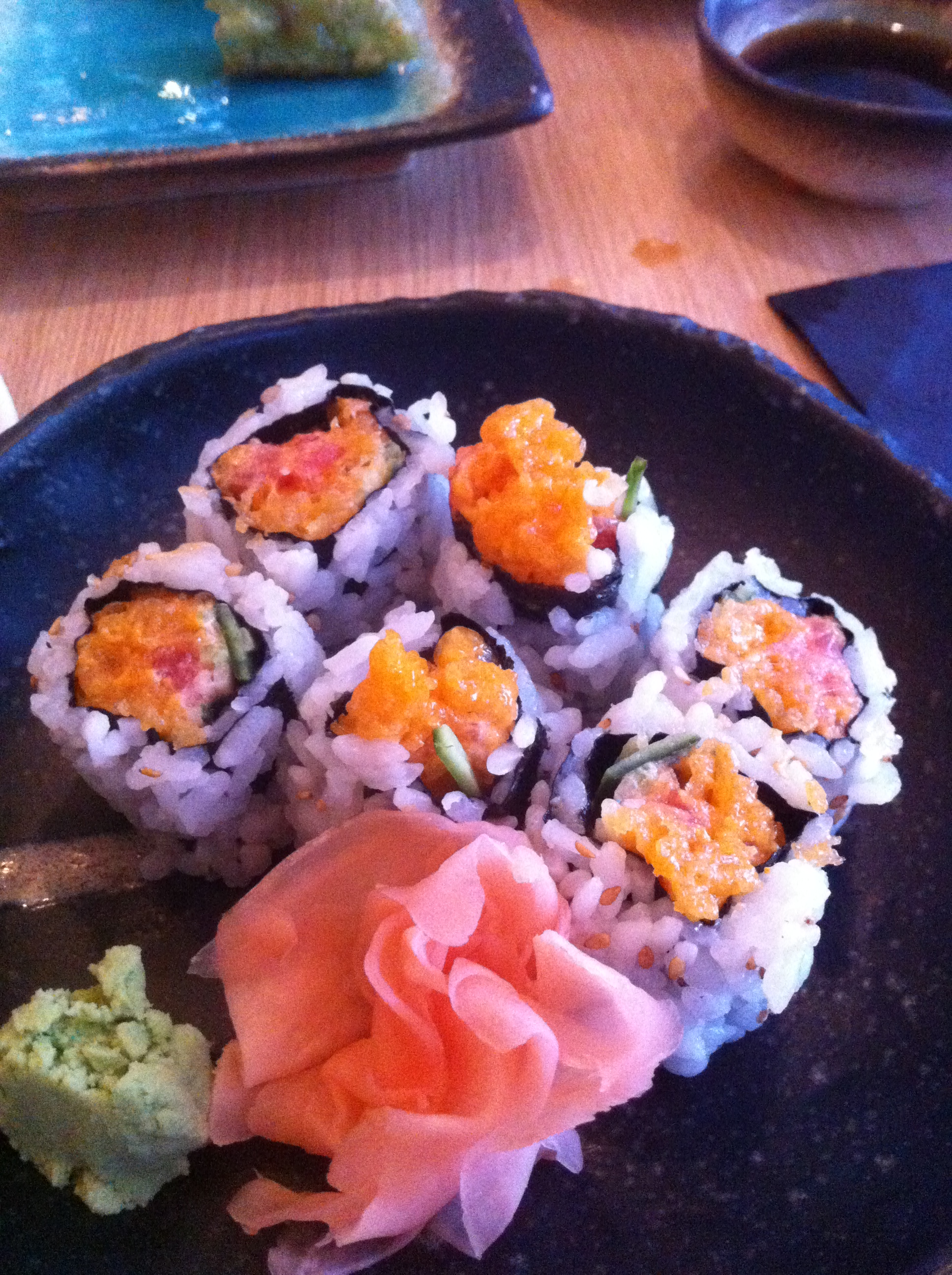 I ordered a Spicy Tuna Roll, which was only OK. It seemed like it had tempura mixed in and I wasn’t a fan of that. Everything else was delicious, though, especially the company and free valet parking 🙂