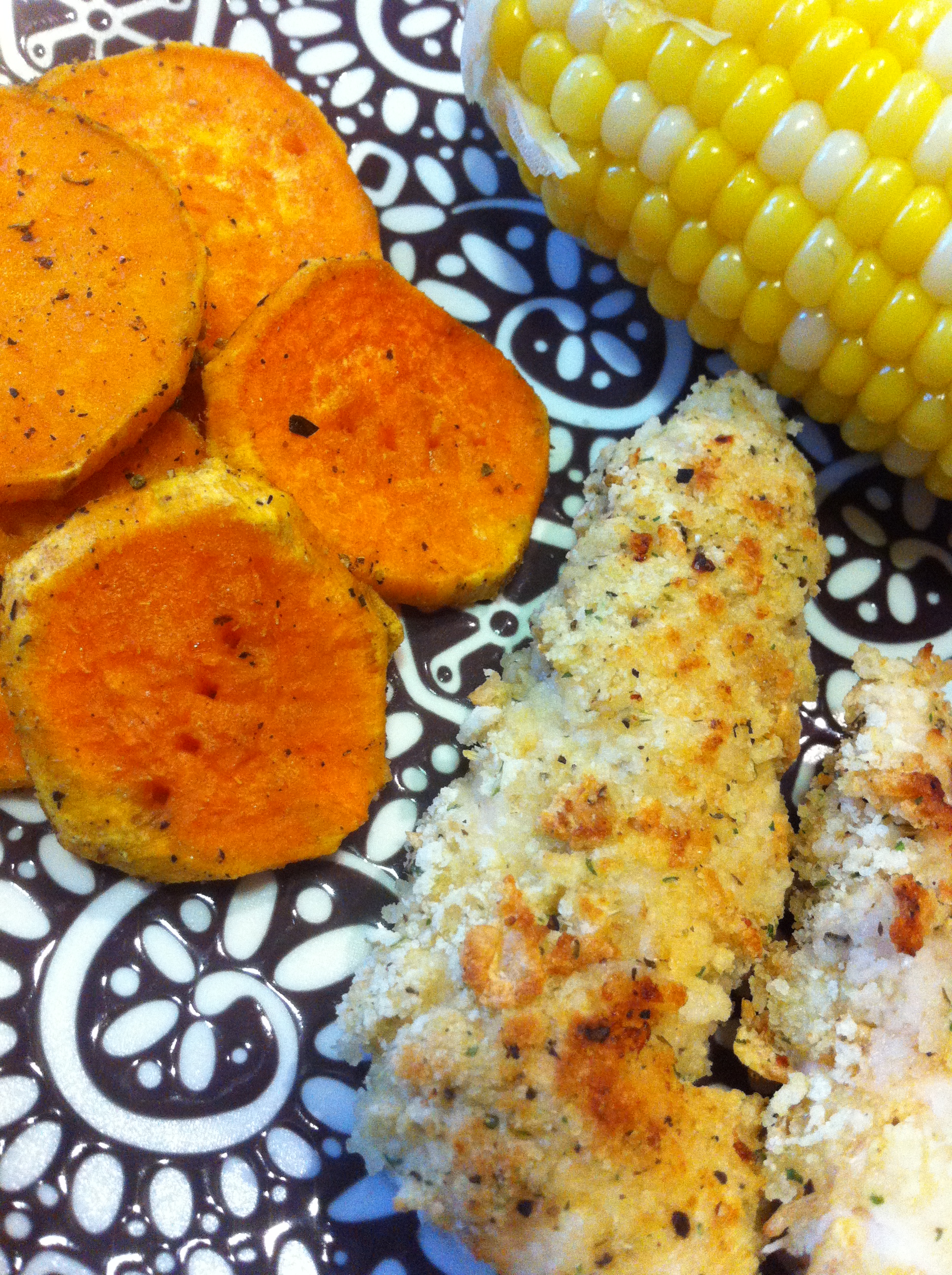 My friend Meredith just posted this fun recipe for chicken tenders so I decided to make some for dinner last night! I didn’t follow her recipe, but it helped me remember that I love making chicken tenders! I also made sweet potato “fries” and had corn on the cob (sorry, it seems like I eat this all the time, but I am obsessed with it lately!!). Fun, easy, healthy Saturday night meal!