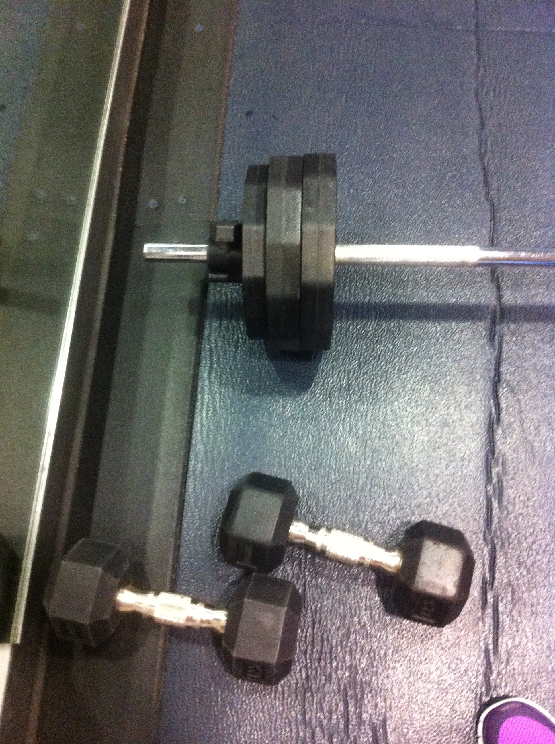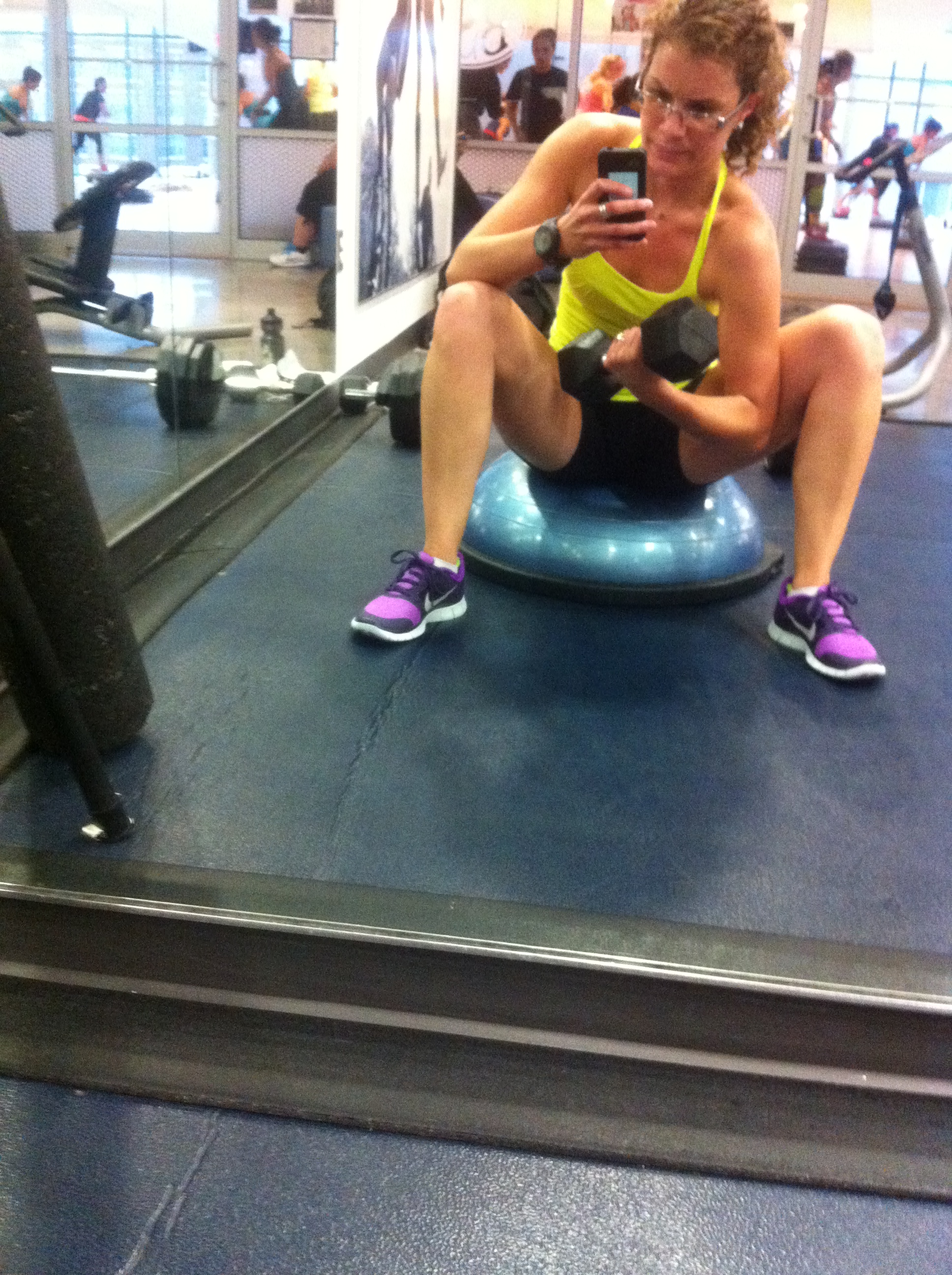 • 25 reps of upper body exercises: isolation curls (25 each arm) while sitting on a BOSU, 1 armed triceps extensions while balancing on 1 leg (25 each side), front & side lat raises (on each side) and reverse flys. (I couldn’t find the weights I needed, so I did 12.5lbs for everything except the lat raises- I used 8lbs as I am still babying my shoulder