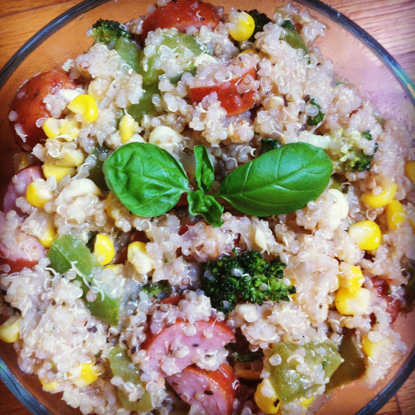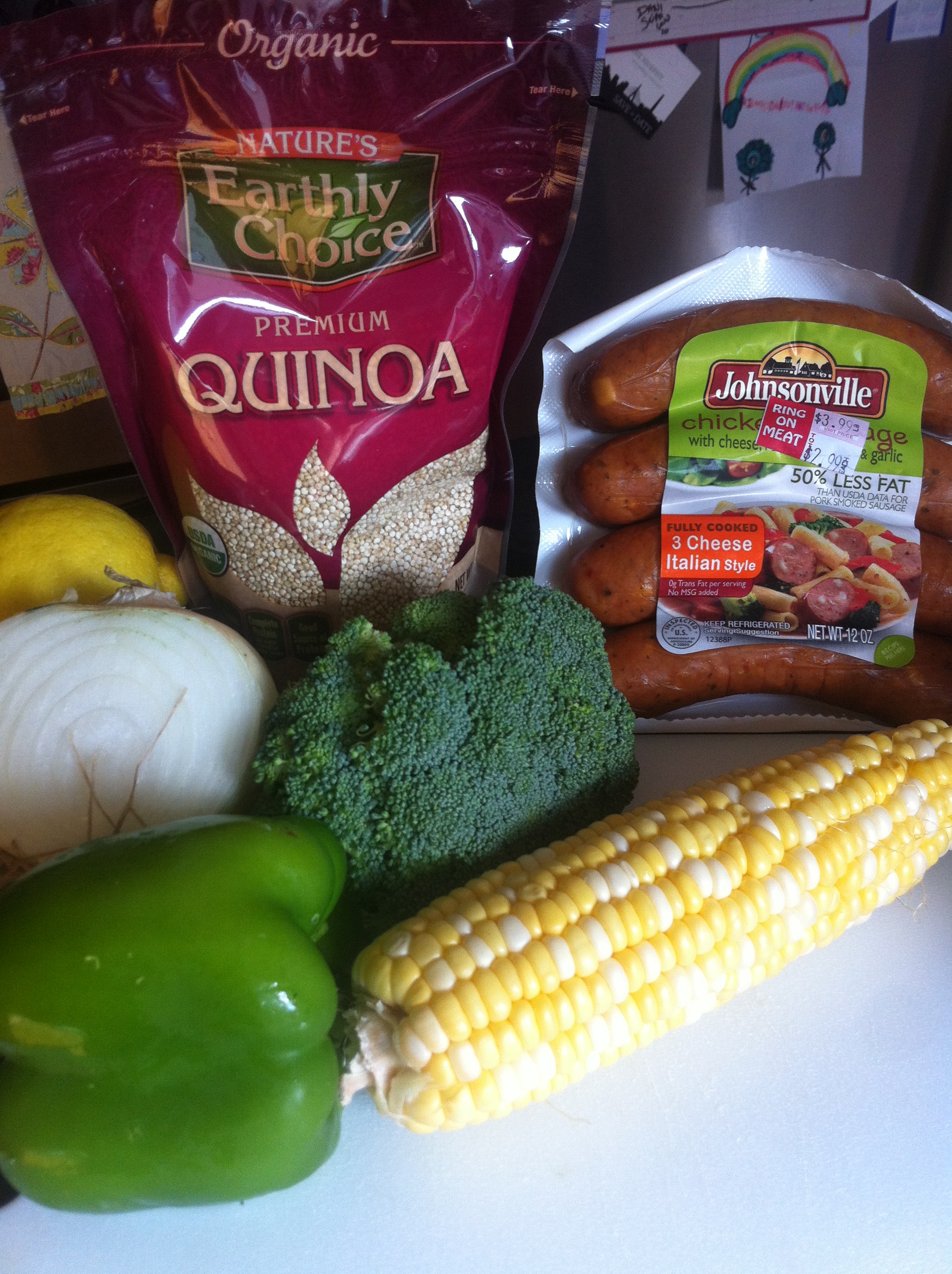 Hey there! After I made that delicious Caprese Orzo Salad, I knew that more summer salads were in my future, and boy was I right! This past weekend was another hot and humid one, so the last thing I wanted to do was turn on the oven and make a big, hot meal. Not only did I not want to cook that, I didn’t want to eat that; no need in raising the body temperature any more than it already was! I got another craving for chicken sausages, so I picked up a package at Market Basket along with some veggies and quinoa. I wasn’t sure if I wanted to do a pasta dish or quinoa dish, but the sale on quinoa made that decision very easy!
