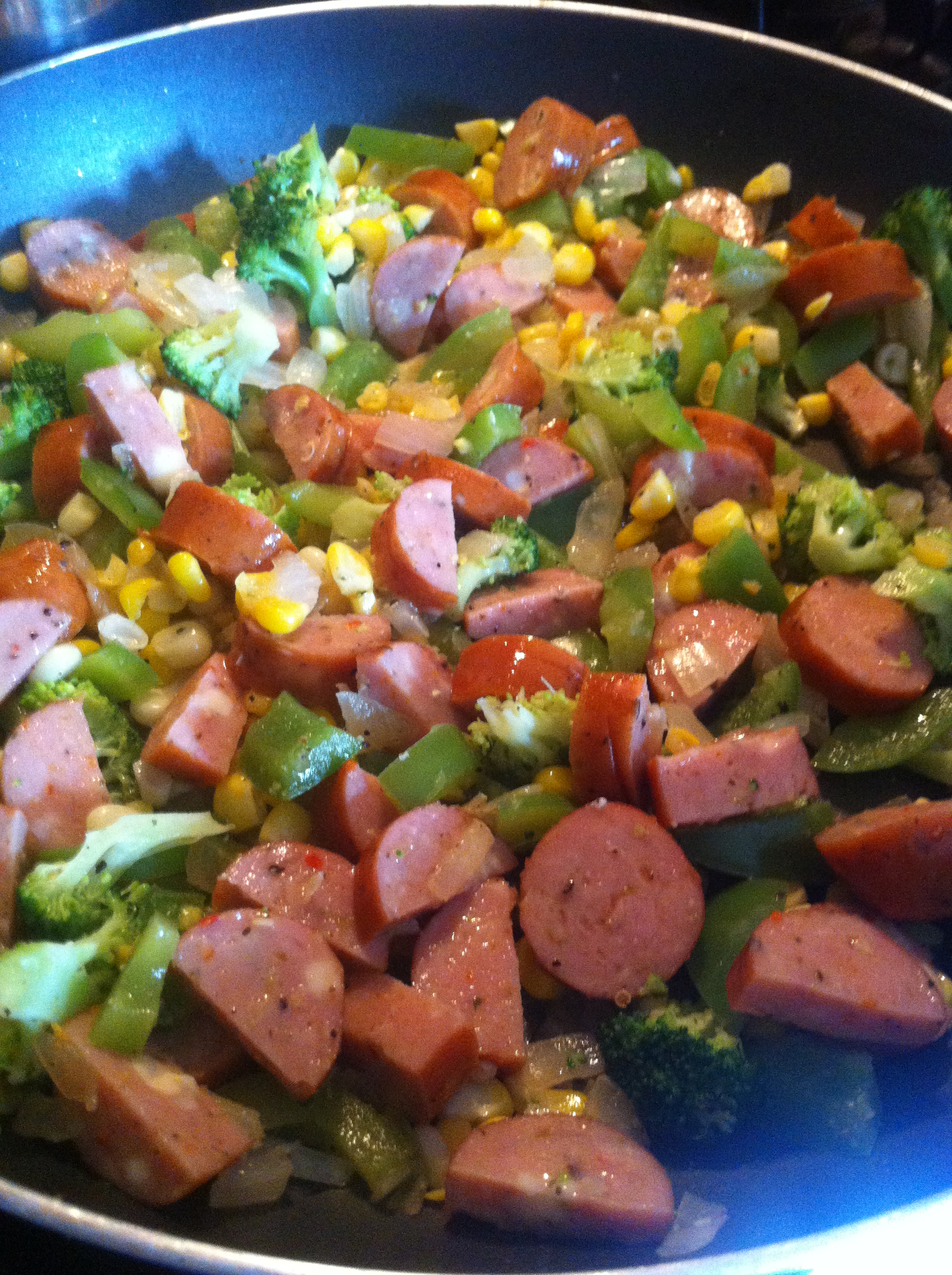 1. Bring chicken broth and quinoa to a boil. Reduce heat and let simmer for about 15 minutes. While the quinoa is cooking, chop your veggies. Let the onions cook first (about 3 minutes) and then add the green peppers, broccoli and corn. I poured a little of the leftover chicken broth into the veggie pan to help steam the veggies a little.