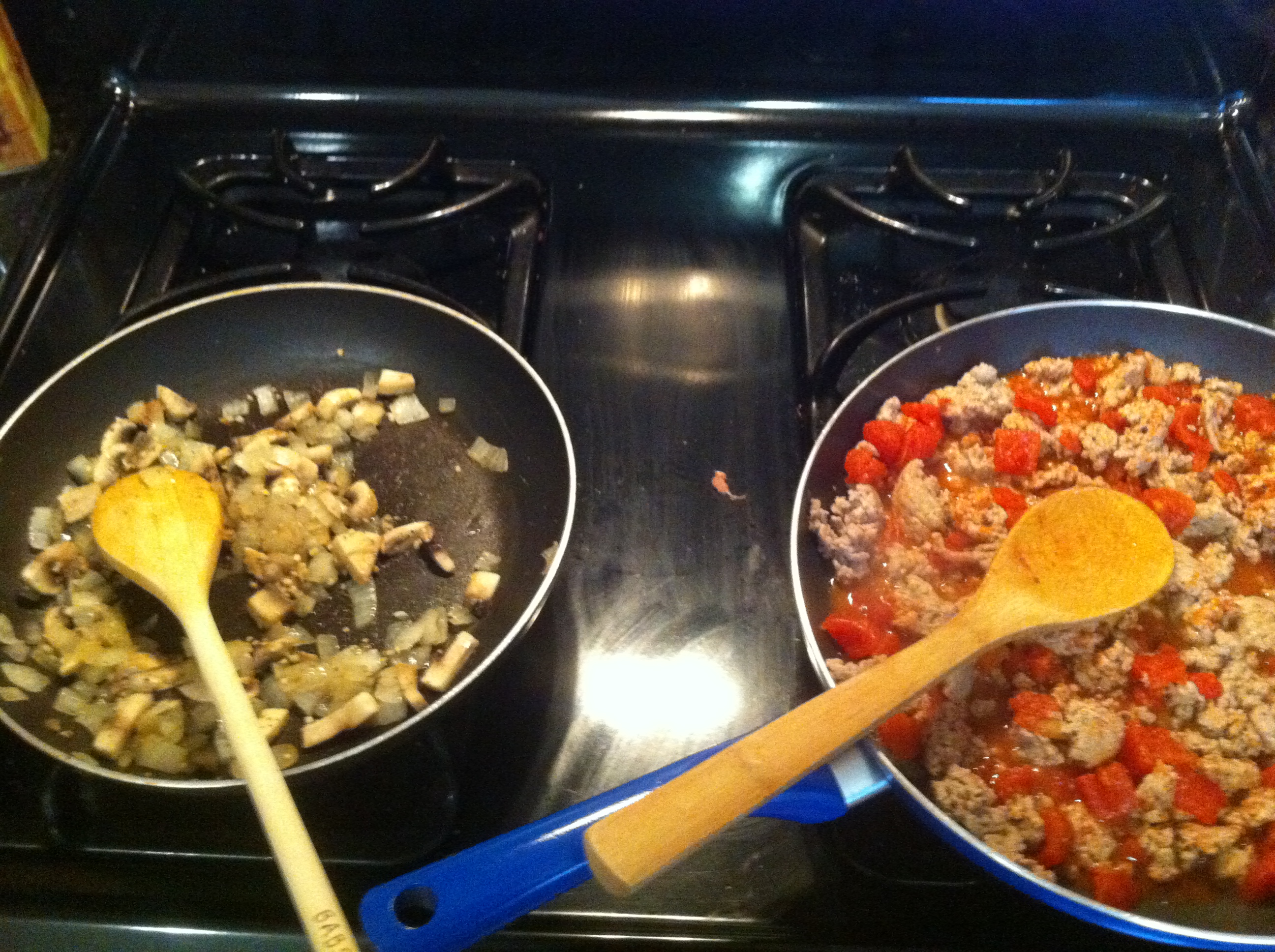 I am a fan of lasagna with a lot of “stuff” in it, so in addition to the ground turkey and ricotta stuffing, I sautéed onions and mushrooms (in wine, of course!) and added in diced tomatoes. I didn’t want to overload the lasagna with too many veggies/flavors, but sautéed onions and mushrooms are such a good combination that I had to add them.