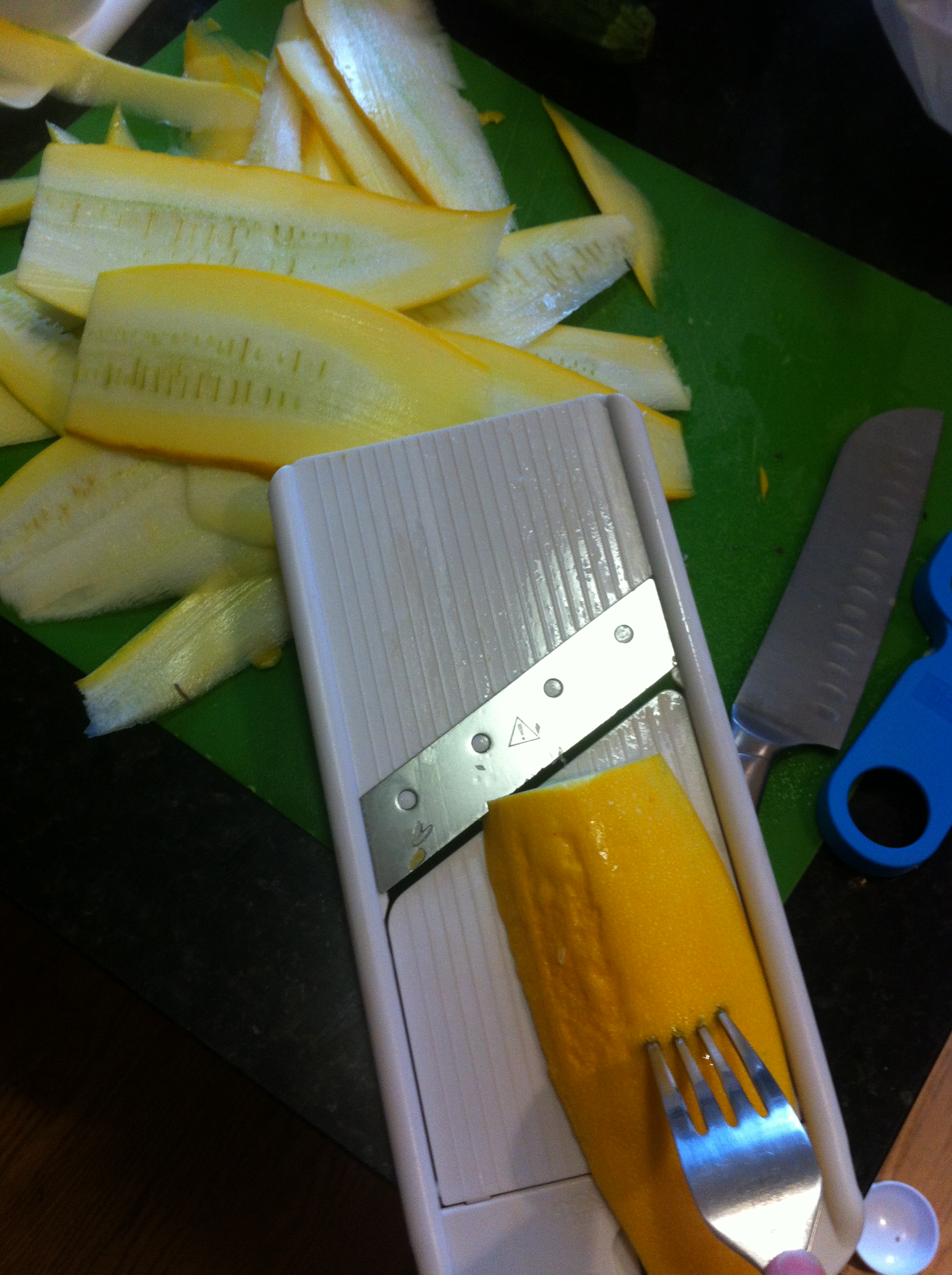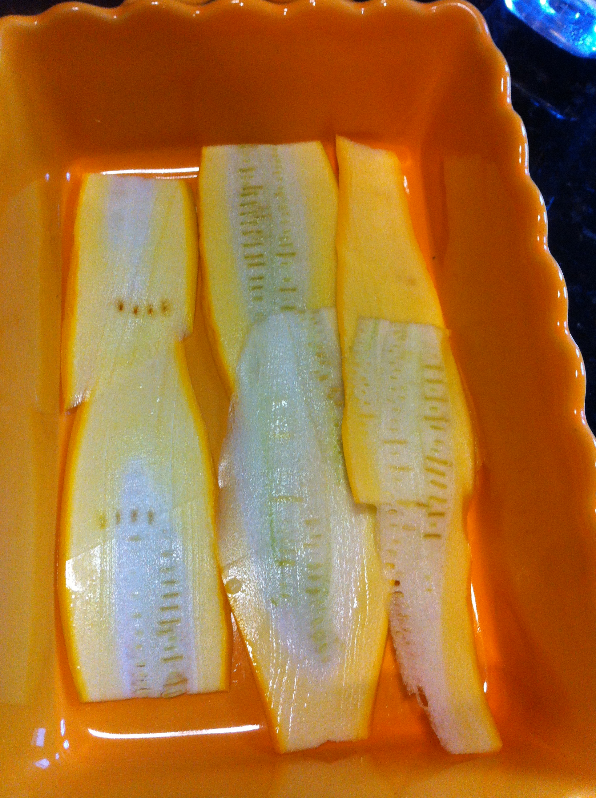 3. Use a kitchen gadget (peeler or a slicer from Pampered Chef) to create thin slices of summer squash and zucchini. Make sure to pat the slices with a paper towel or place them on a paper towel to help absorb some of the water. I didn’t do this, and I ended up with a very watery lasagna!