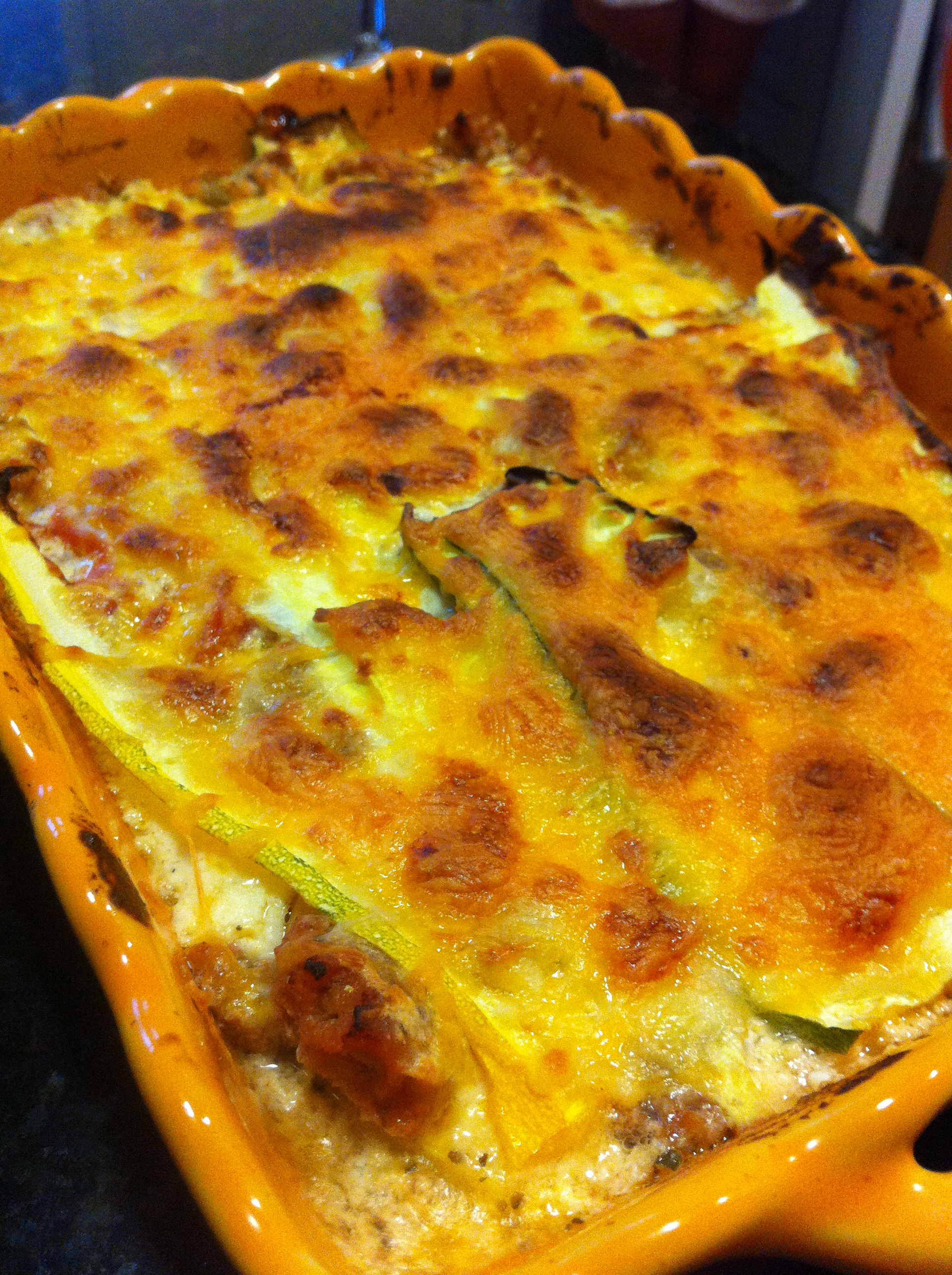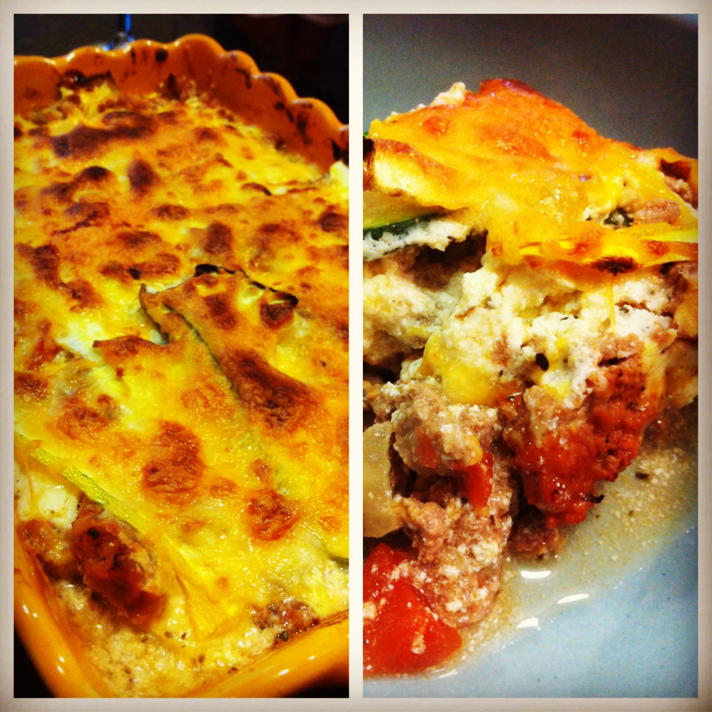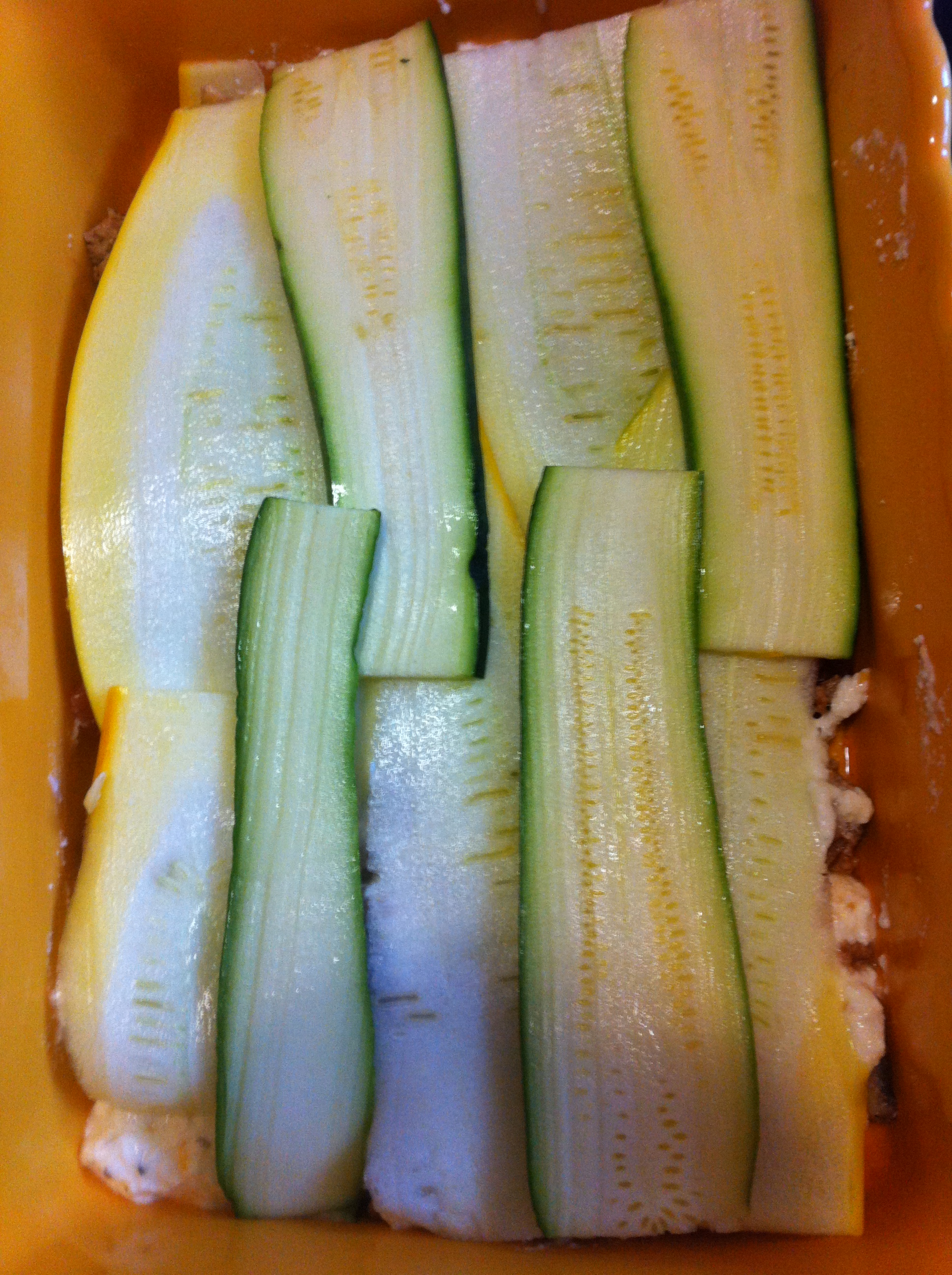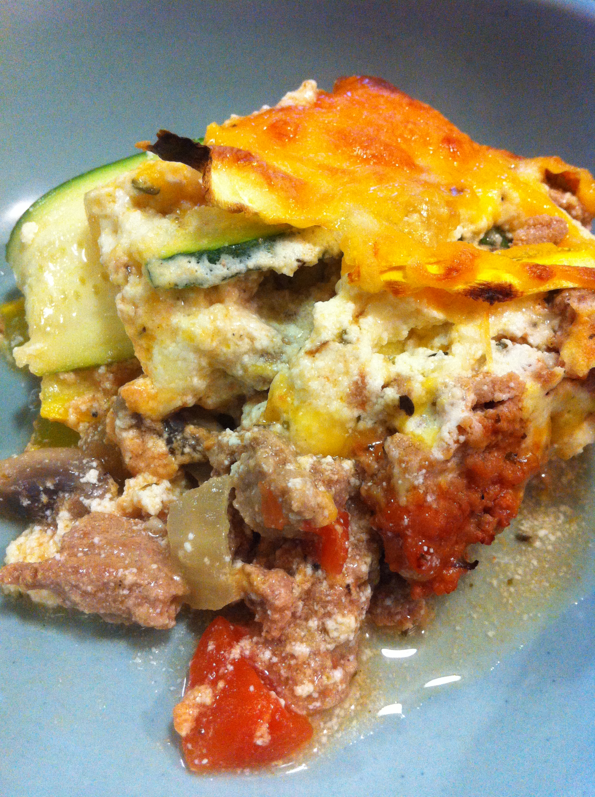 I didn’t really have a recipe in mind, but I knew the basis of a lasagna recipe: ricotta cheese, egg, meat/filling, and noodles (or, summer squash and zucchini in my case). With that said, I did double-check my idea of a recipe against a number of different websites. Man, there are A LOT of different lasagna recipes out there; some of them are so detailed and ingredient heavy, which was not at all what I was looking for. So, I went simple! And, you know what? You couldn’t even tell the difference!