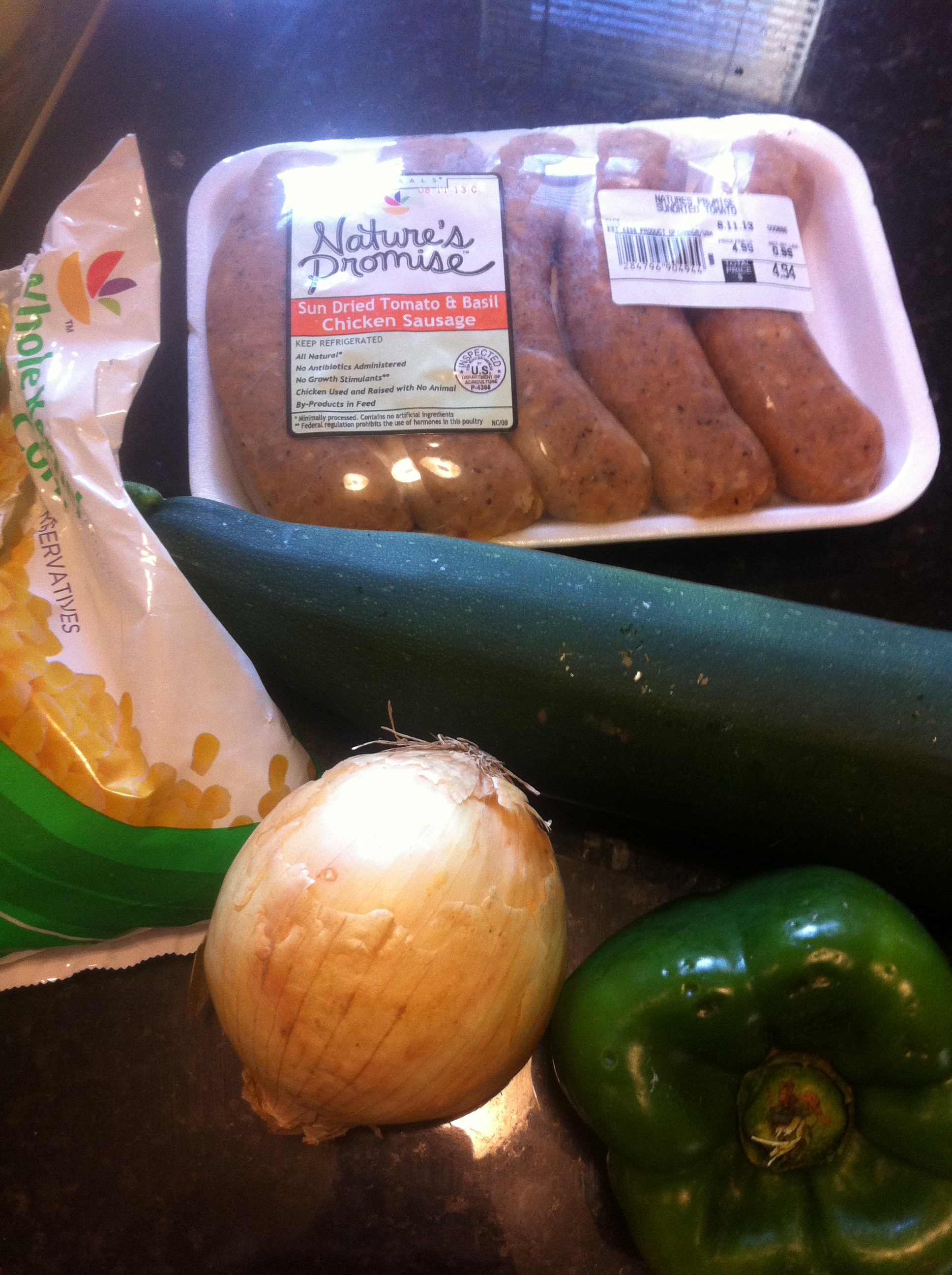 Anyway! I’ve seen some zucchini boats floating around the blog world and internet world and since I had a decent sized zucchini (not obscenely large like the summer squashes above), I figured that was the perfect thing to make this week! I didn’t want to stuff it with ground chicken since I just used ground chicken in my Summer Squash and Zucchini Lasagna that I made last week, so my mom suggested that I buy uncooked chicken sausage, take it out of the casing and cook it on the stove as I would ground chicken or sausage. Mom, this was a great idea! Chicken sausage is so much more flavorful than ground chicken so it’s always a great addition to a veggie-filled meal.