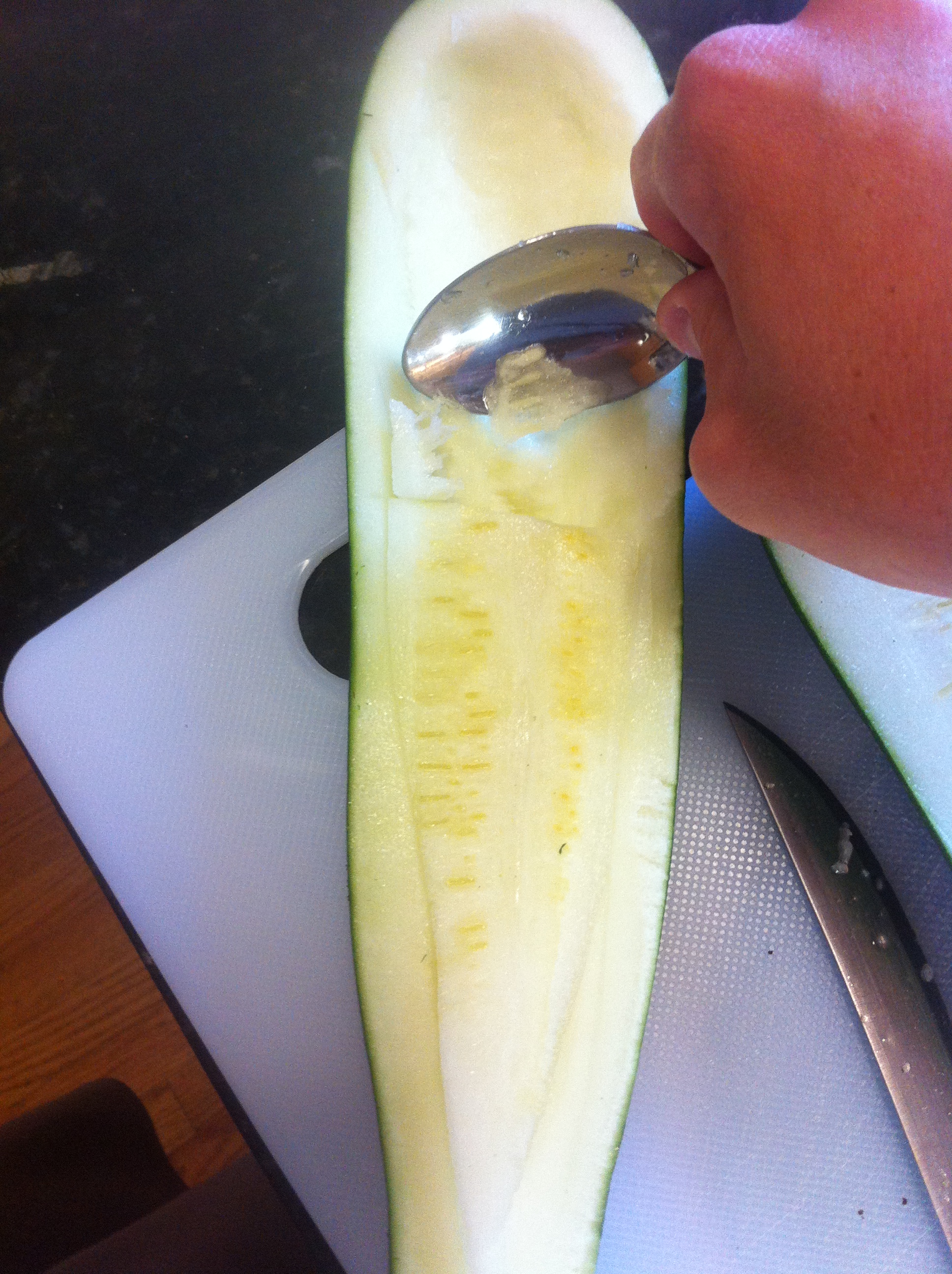 1. Slice the zucchini lengthwise and scoop out the seed part to create the “boat” that will hold the stuffing.