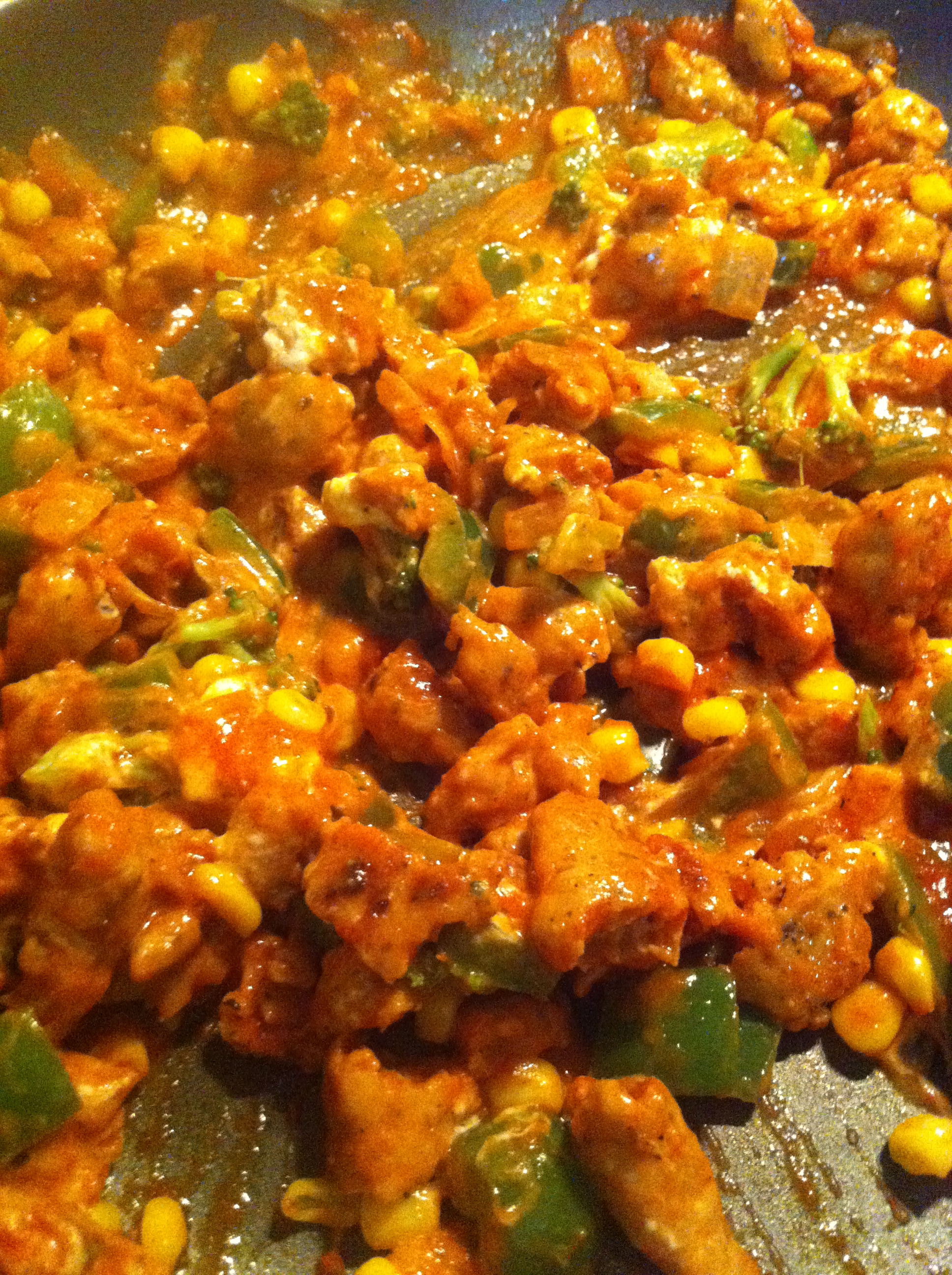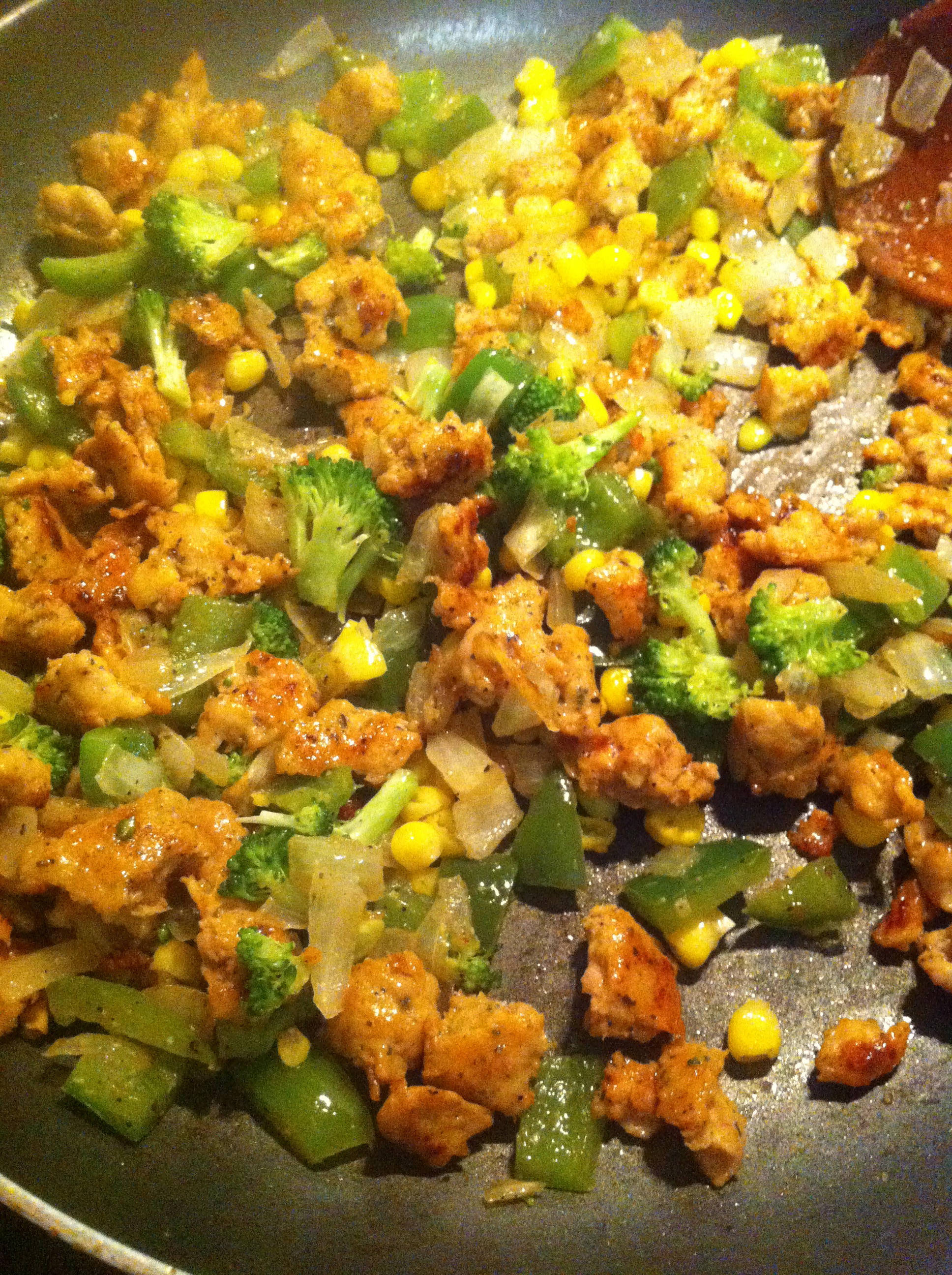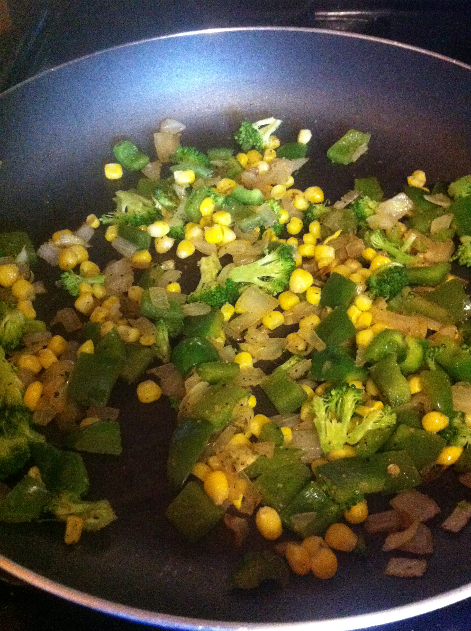 2. Cut up the veggies and cook them in the pan. I always cook the onions first (for about 3 minutes or until translucent) and then I add the green peppers, broccoli and then corn. While these are cooking, I throw all sorts of herbs and seasonings into the pan: sea salt, pepper, garlic powder, Italian seasoning, oregano, etc.