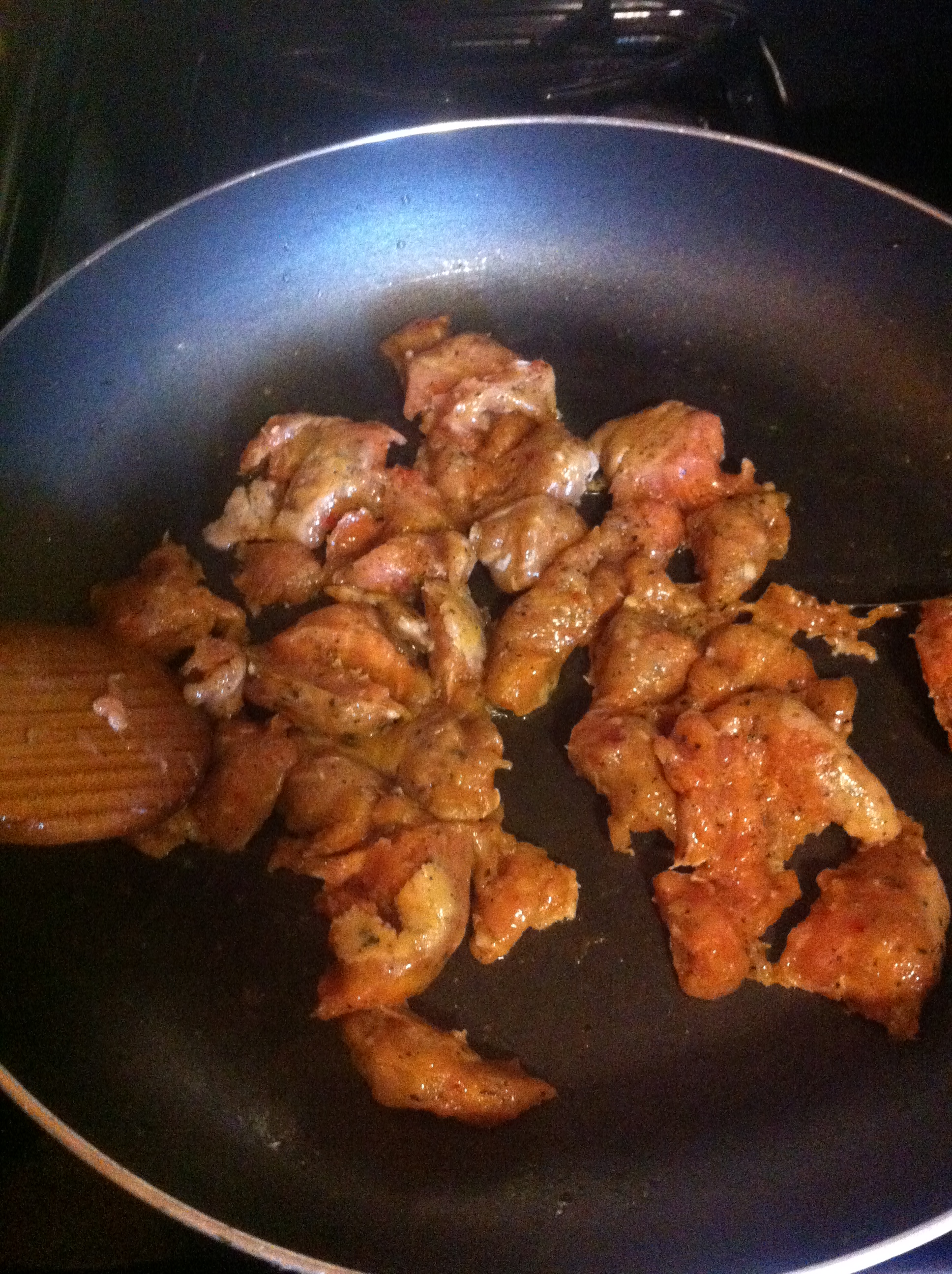 3. When the veggies have finished cooking, remove from the pan and add the chicken sausage (removed from the casing). Cook just as you would cook ground chicken. When it’s fully cooked, the veggies back in, as well as 1/2 cup of marinara sauce and 1 tbsp. of cream cheese. The cream cheese helps to make a nice, smooth sauce (learned this tip from mom).