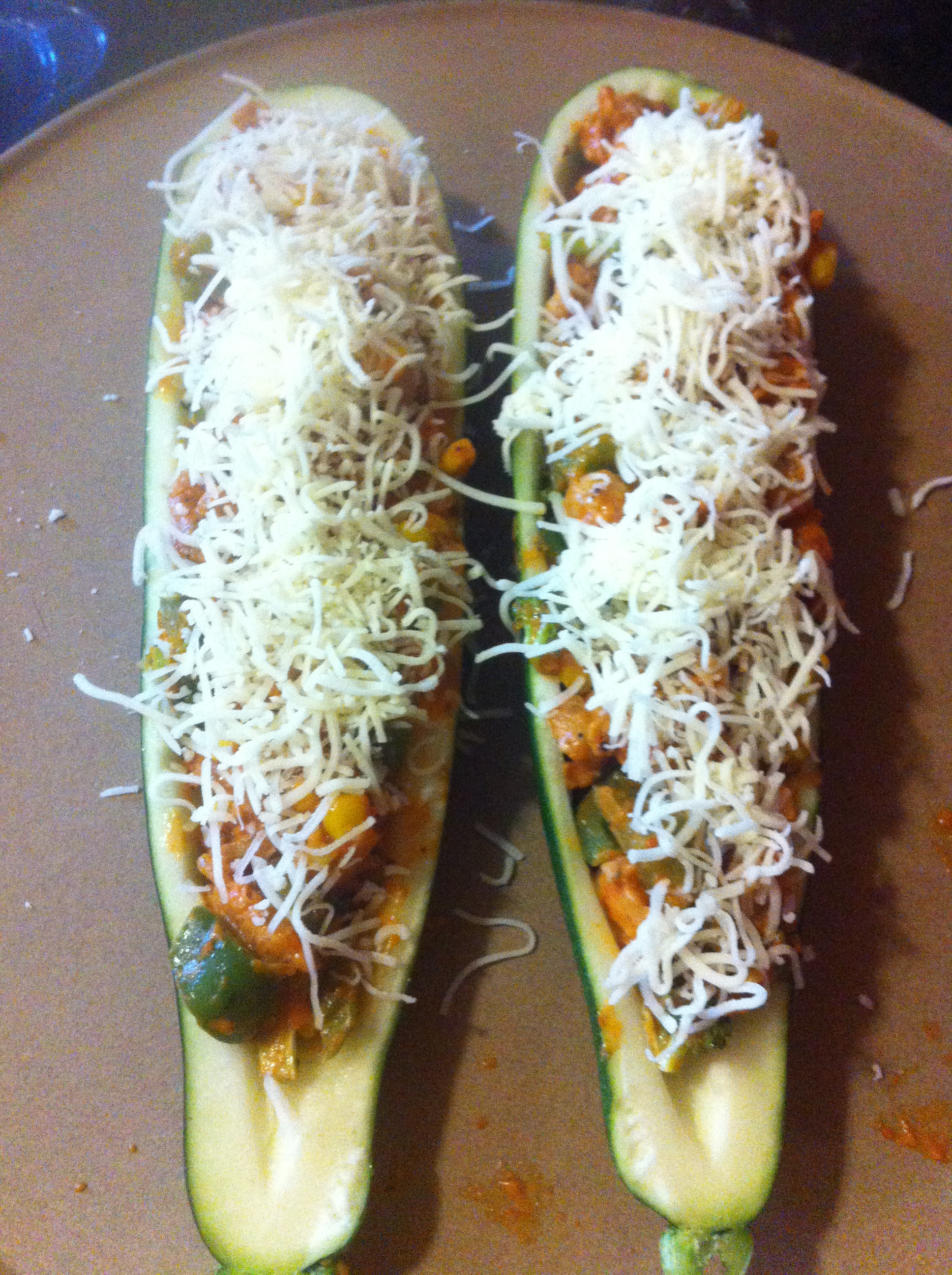 I also cooked up my favorite veggies to have in any dish: onions, peppers, broccoli and corn. As I thought about what I could use to help keep everything together in the boats, as well as provide a little boost of flavor, I remembered another trick from mom: add cream cheese or any other type of cheese dip to veggies, because it makes it seem like you’re eating a rich, cream sauce when you’re not! Mixing red sauce and cream cheese was just what the dish needed! I highly suggest trying this recipe if you, too, have zucchini and/or summer squash growing out of your ears.