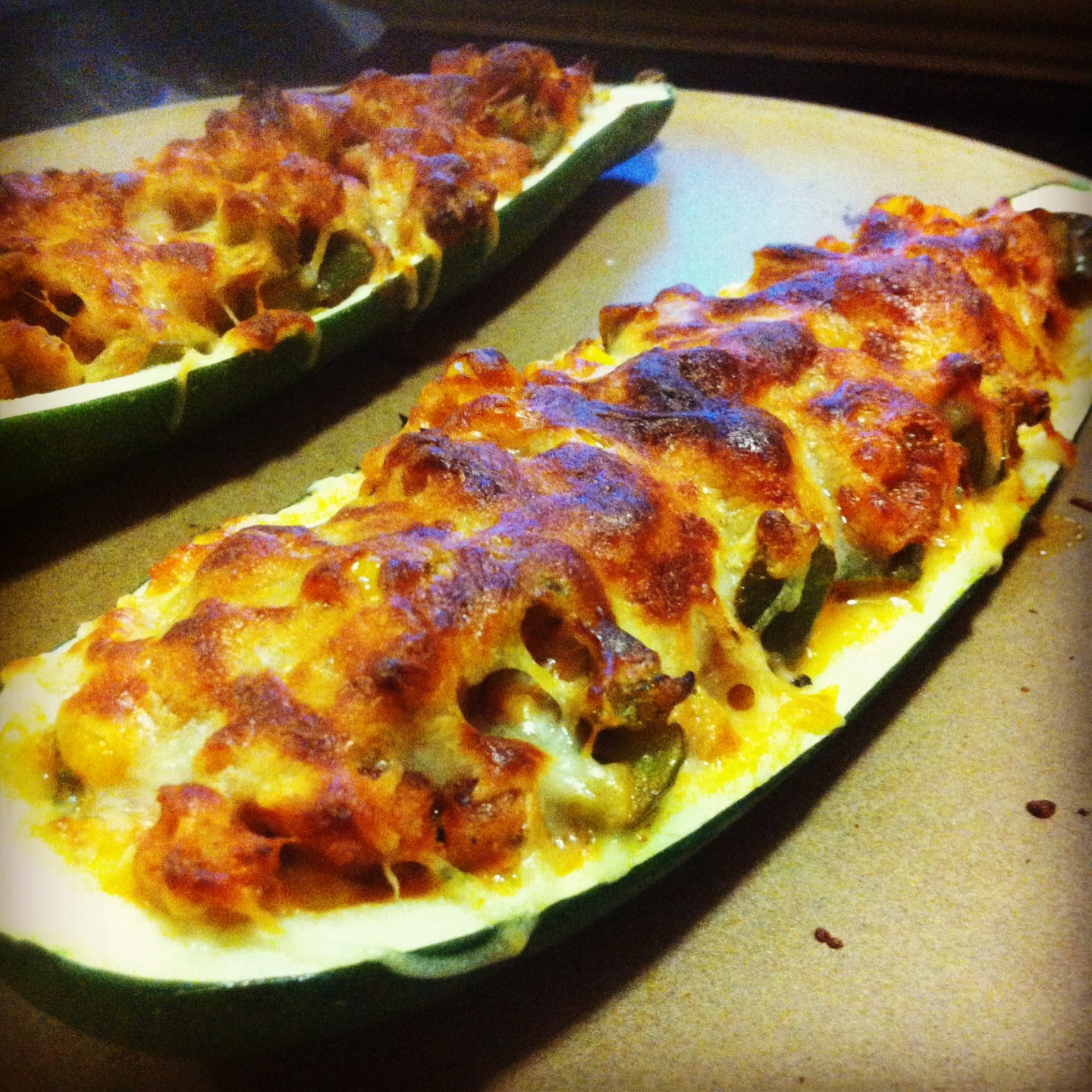4. Once everything is combined, scoop it into the boats, top with cheese and bake at 350* for 20 minutes. After 20 minutes, broil for 5 minutes or until the cheese gets nice and browned.