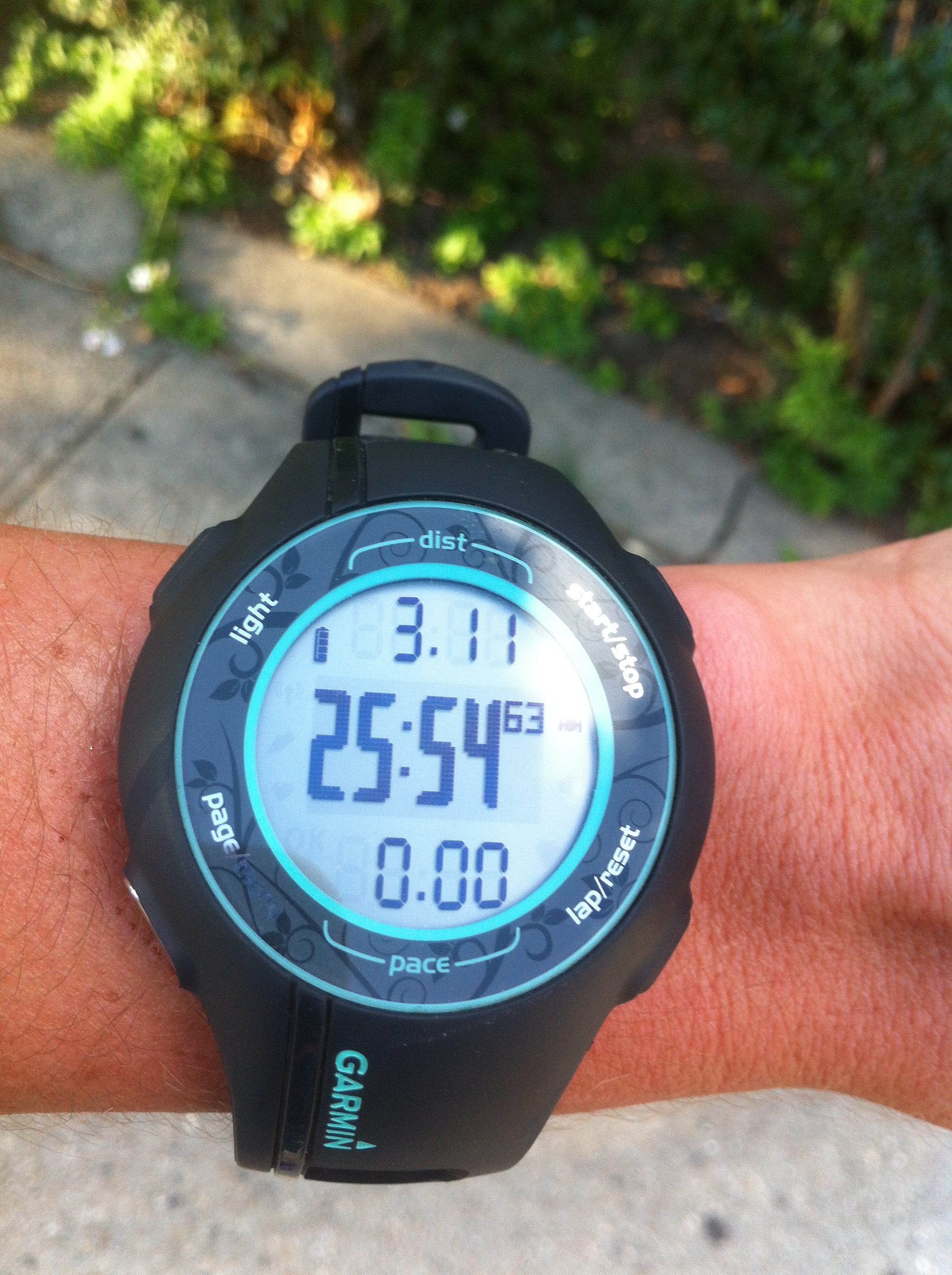 - Friday- I went for a 5K run after work and made a new PR (personal record) of 25:46. I hit stop, but apparently it didn’t stop, hence the time on the watch. It was fun running after work for a change.