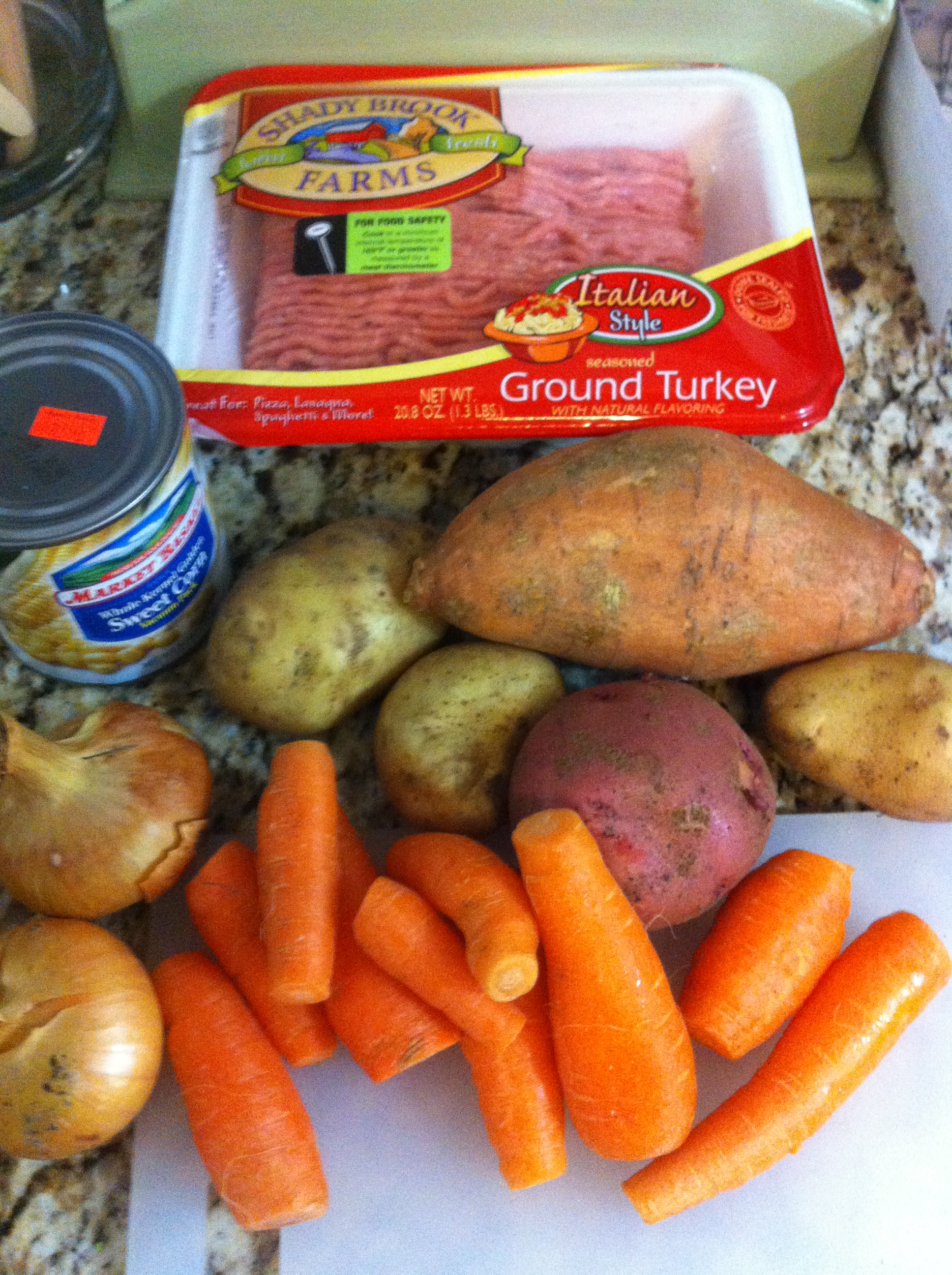 I say “Shepherds Pie” in quotations because even though this recipe follows the general idea of Shepherds Pie, I made some healthier substitutions where I could. The traditional recipe calls for regular white potatoes and ground beef and while there is nothing wrong with either of those items, I prefer to use sweet potatoes (or a combination of sweet and regular) for their nutritional value (and, ok, taste- I think they taste so much better than regular potatoes) and ground turkey as I am not a huge beef person. Don’t get me wrong, I love a good, juicy burger or piece of steak every now and then, but most of the time I use ground chicken or ground turkey instead of beef since it’s a little more in line with the way I like to eat.