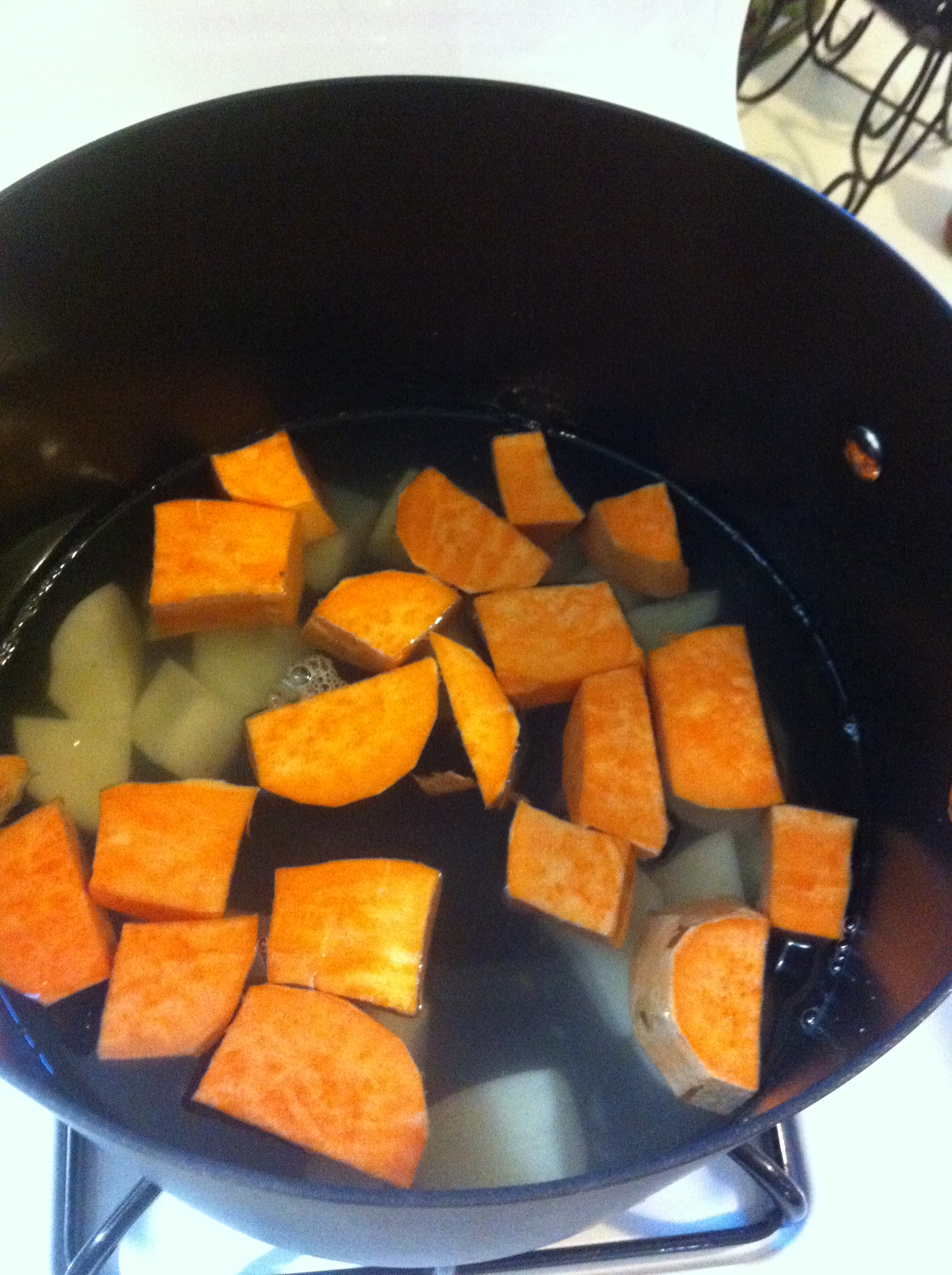 1. Peel and chop your potatoes. Place into a big pot and cover with water. Bring to a boil and let it boil until the potatoes are soft.