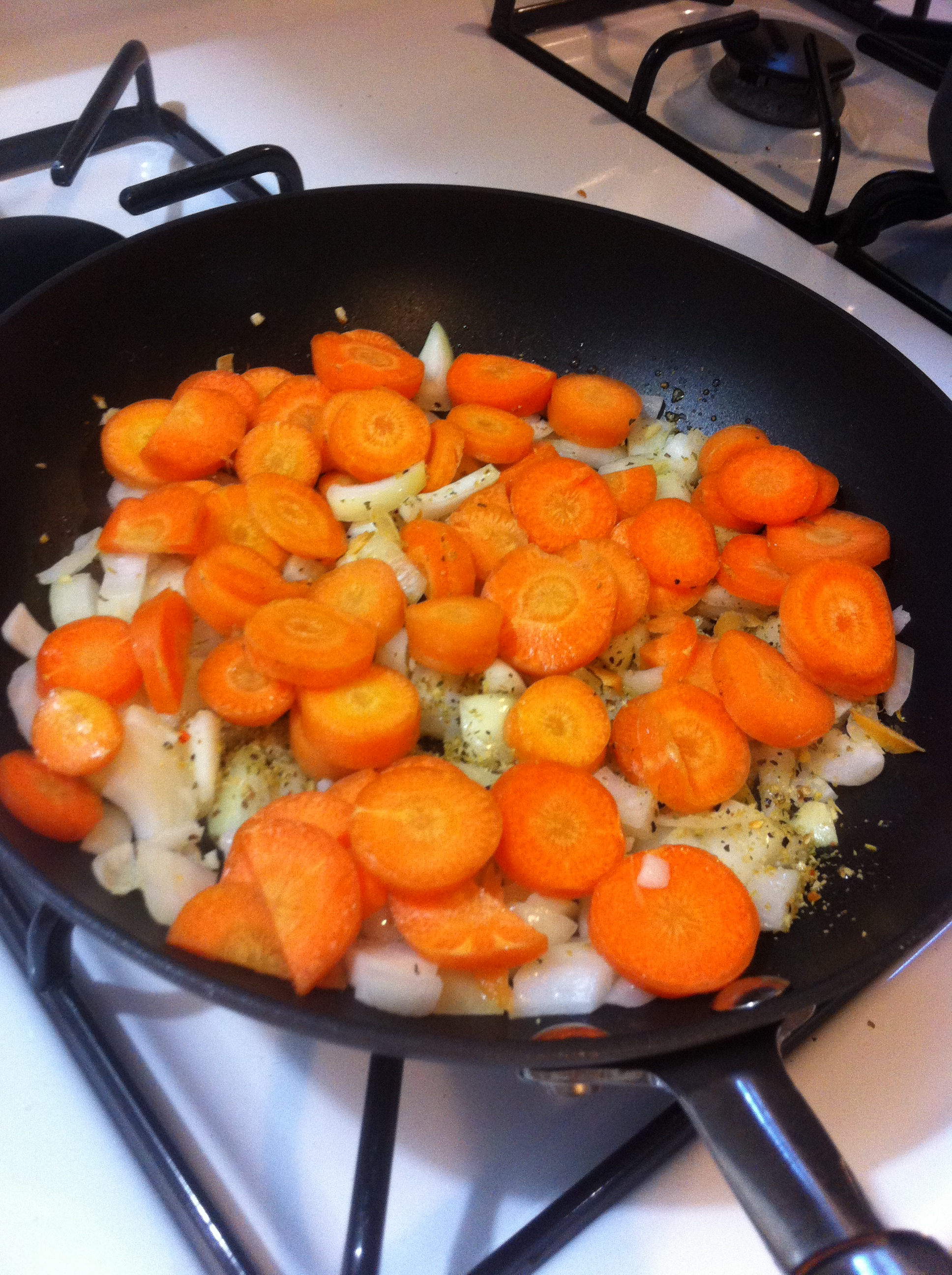 2. While the potatoes are cooking, preheat your oven to 350* and chop your carrots and onions. Heat a medium skillet with a tbsp. of olive oil and add the onions and carrots. Add in herbs/seasonings of your choice and cook until onions are translucent and carrots are soft.