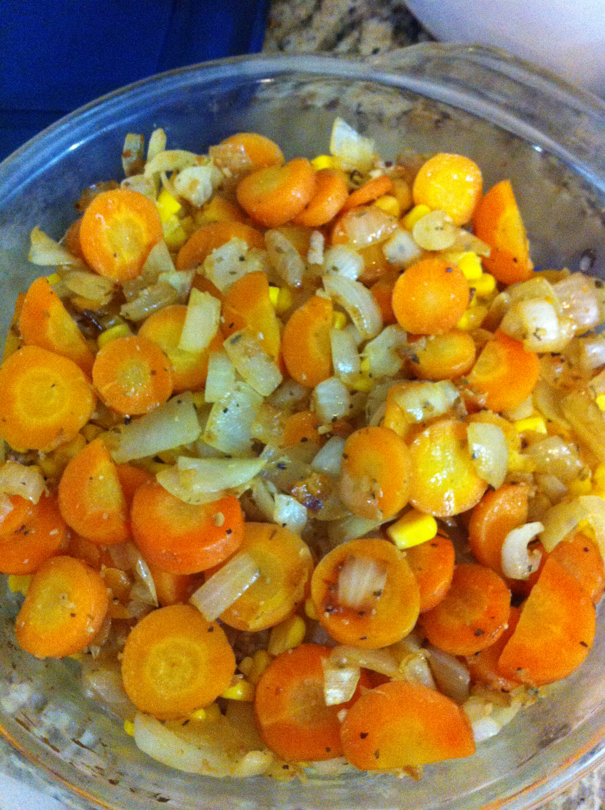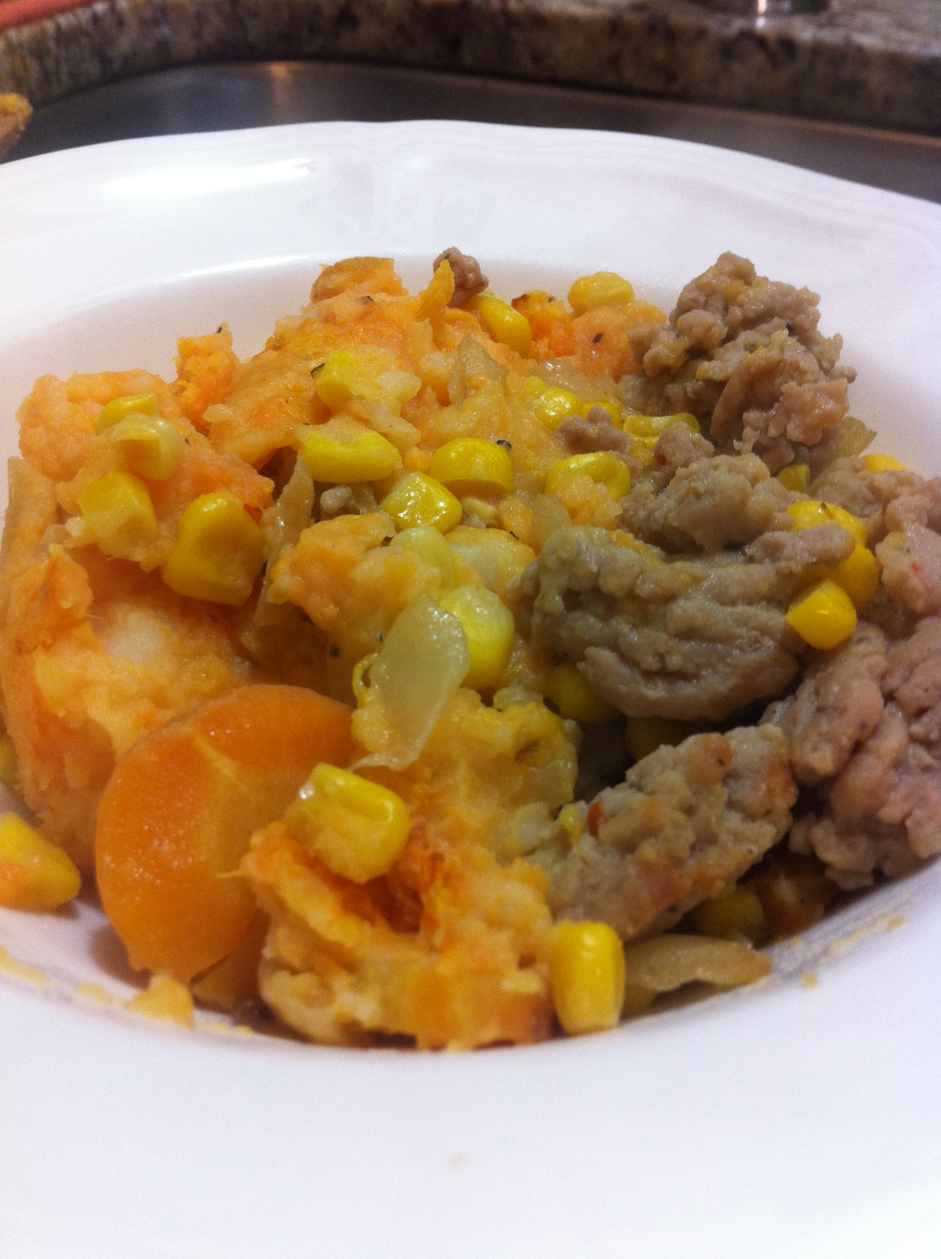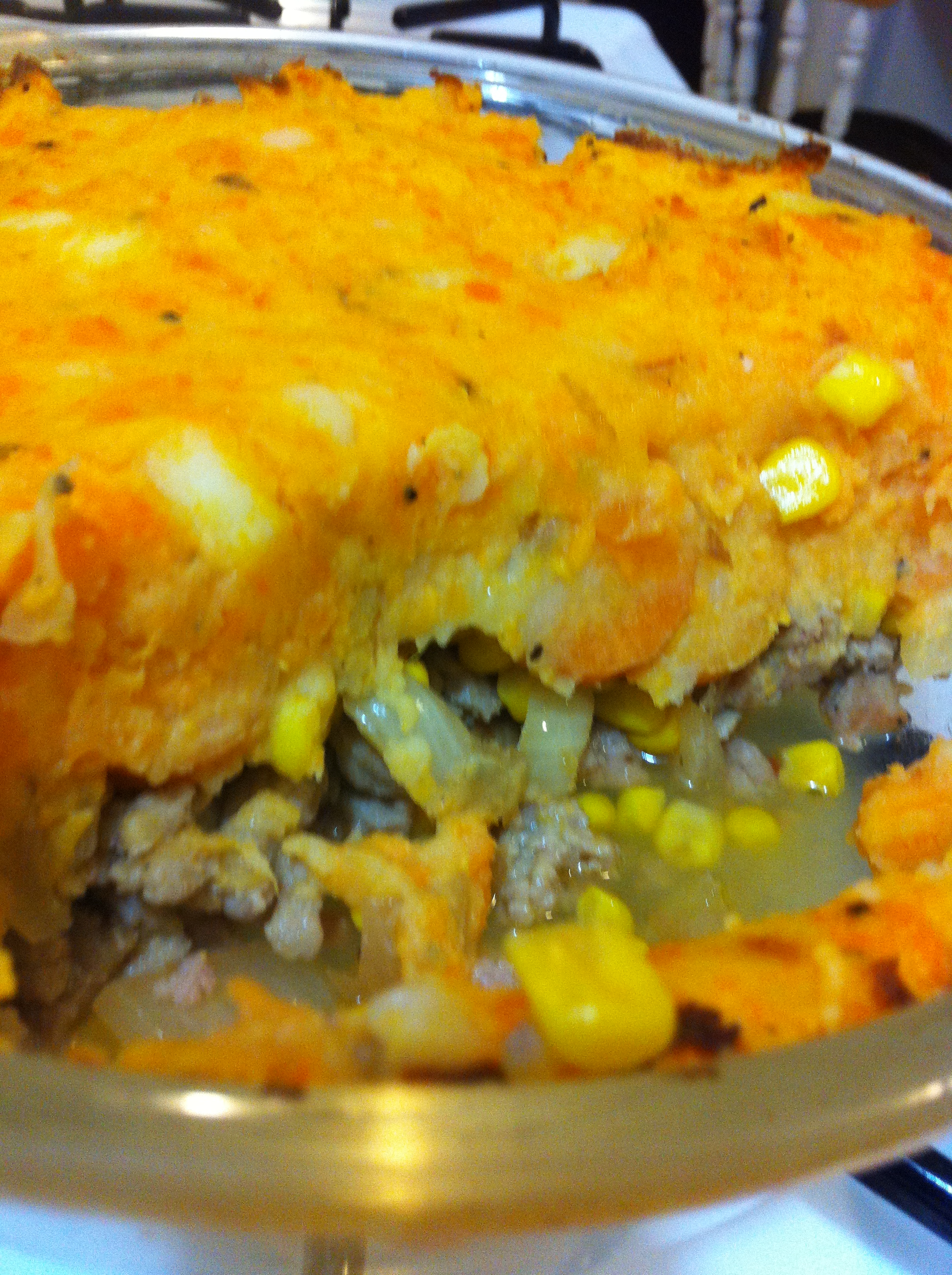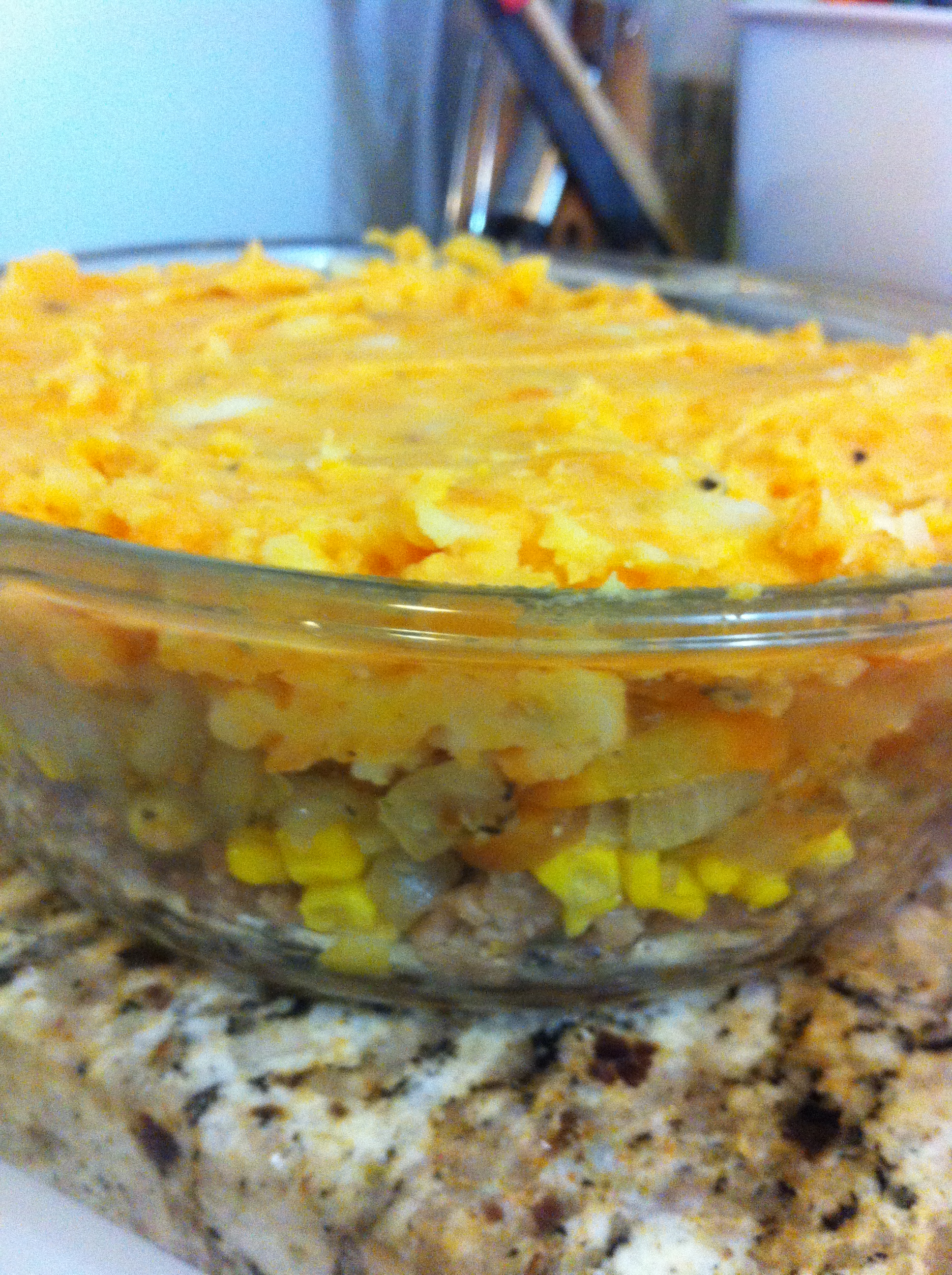 5. At this point, everything should be ready to assemble. Place the meat at the bottom of a casserole dish, then layer the carrots, onions and corn. Finally, top with the mashed potatoes. Bake at 350* for 20-30 minutes or until the top has browned up.
