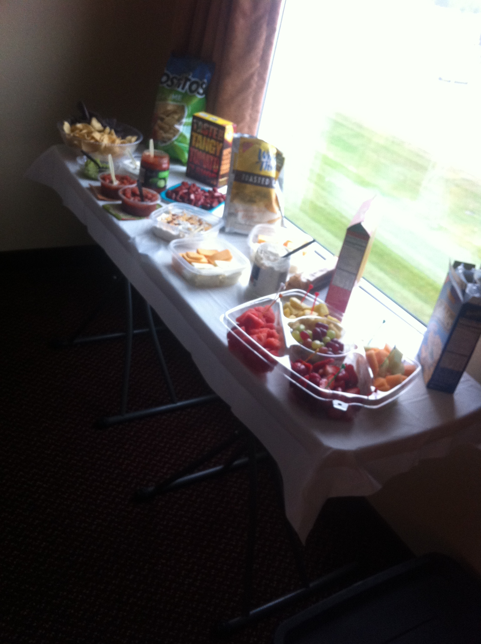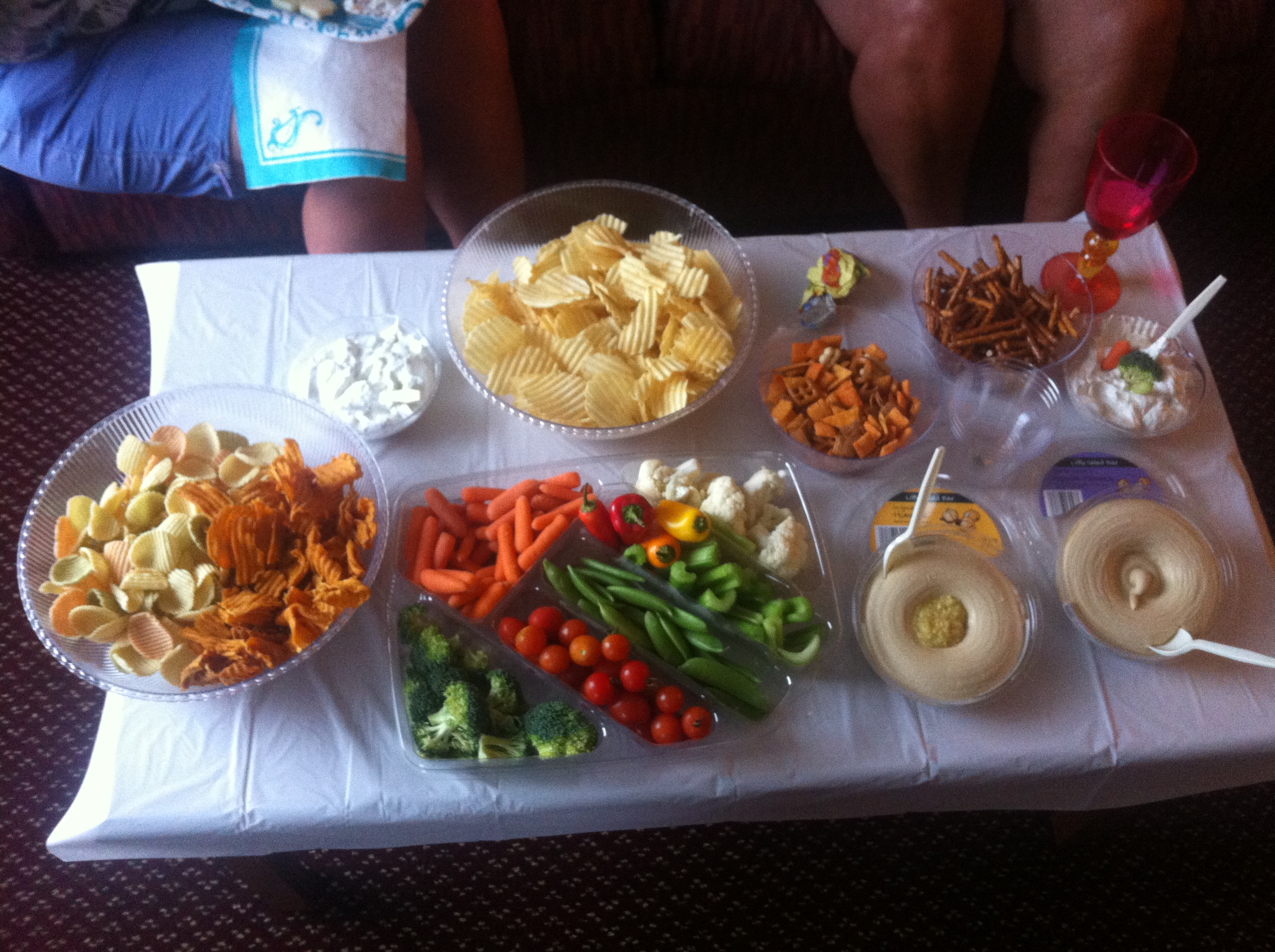My aunt and uncle (mom and dad of the bride) had a wonderful cocktail hour set up in their hotel room for everyone. Between my dad’s snacks/food for me and this cocktail hour, I couldn’t have been more spoiled with “Monique-like” treats. Seriously… look at this spread!