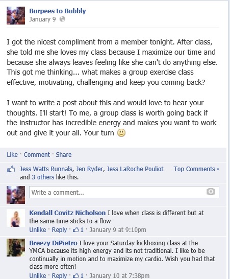 As I stated in my status, one of the most important things for me is the instructors personality and energy. I know some people may prefer the quieter/more subdued instructors, but me? Nahhh. I’m all about the energy, the jumping around, the “yipping” and “yooing” (anyone who comes to my classes knows I LIVE for that!) and anything that gets people to smile and maybe even laugh.