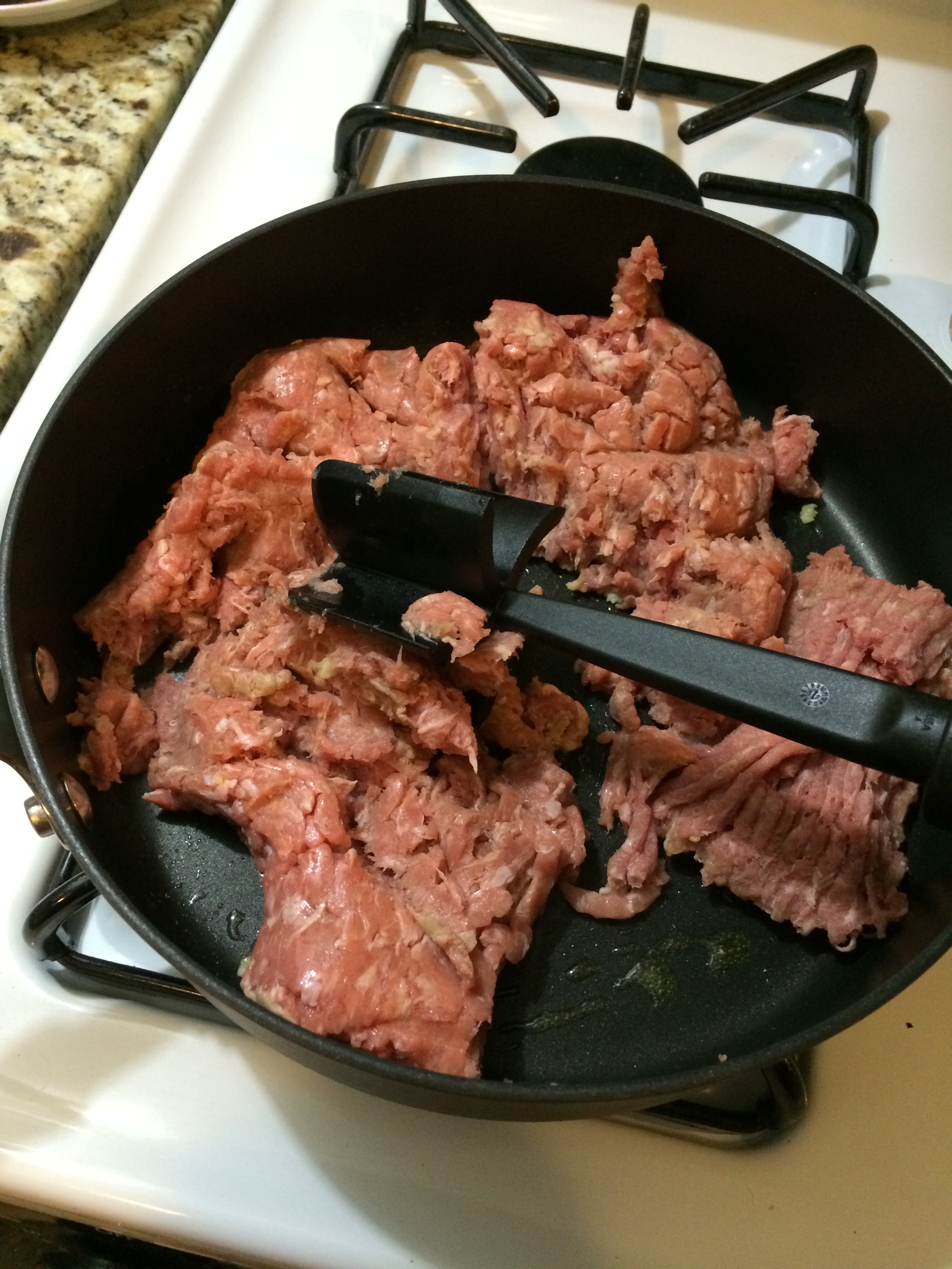 1. Pre-heat oven to 350*. Brown the ground turkey. I added seasonings as well. I also got to use my new meat utensil that I got from my Pampered Chef party… loved it! If your lasagna noodles need to be cooked before you bake the lasagna, do that now as well.
