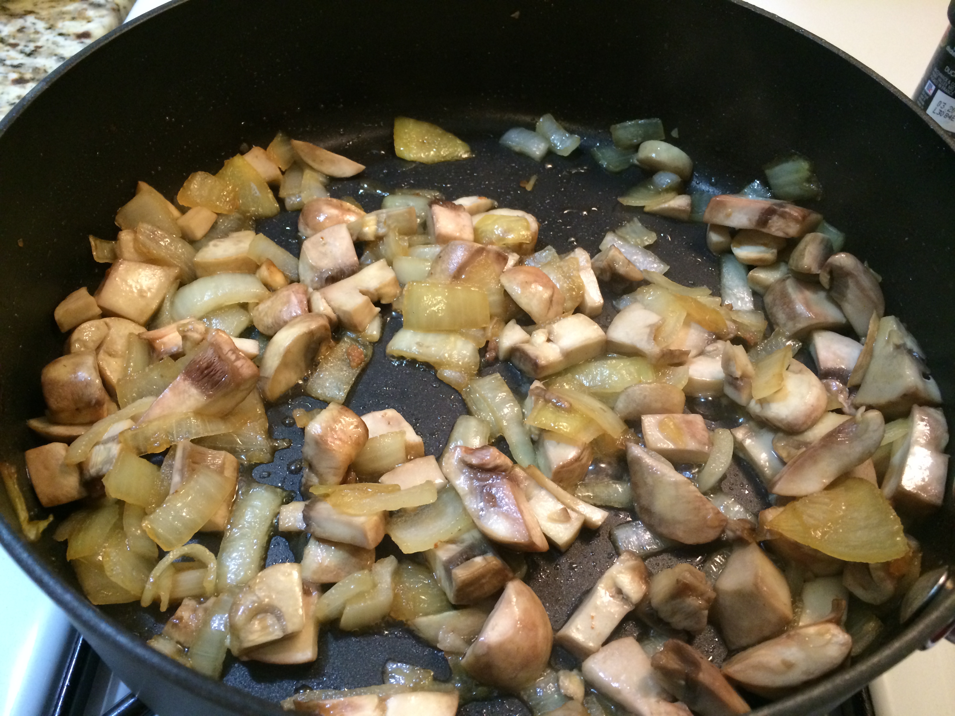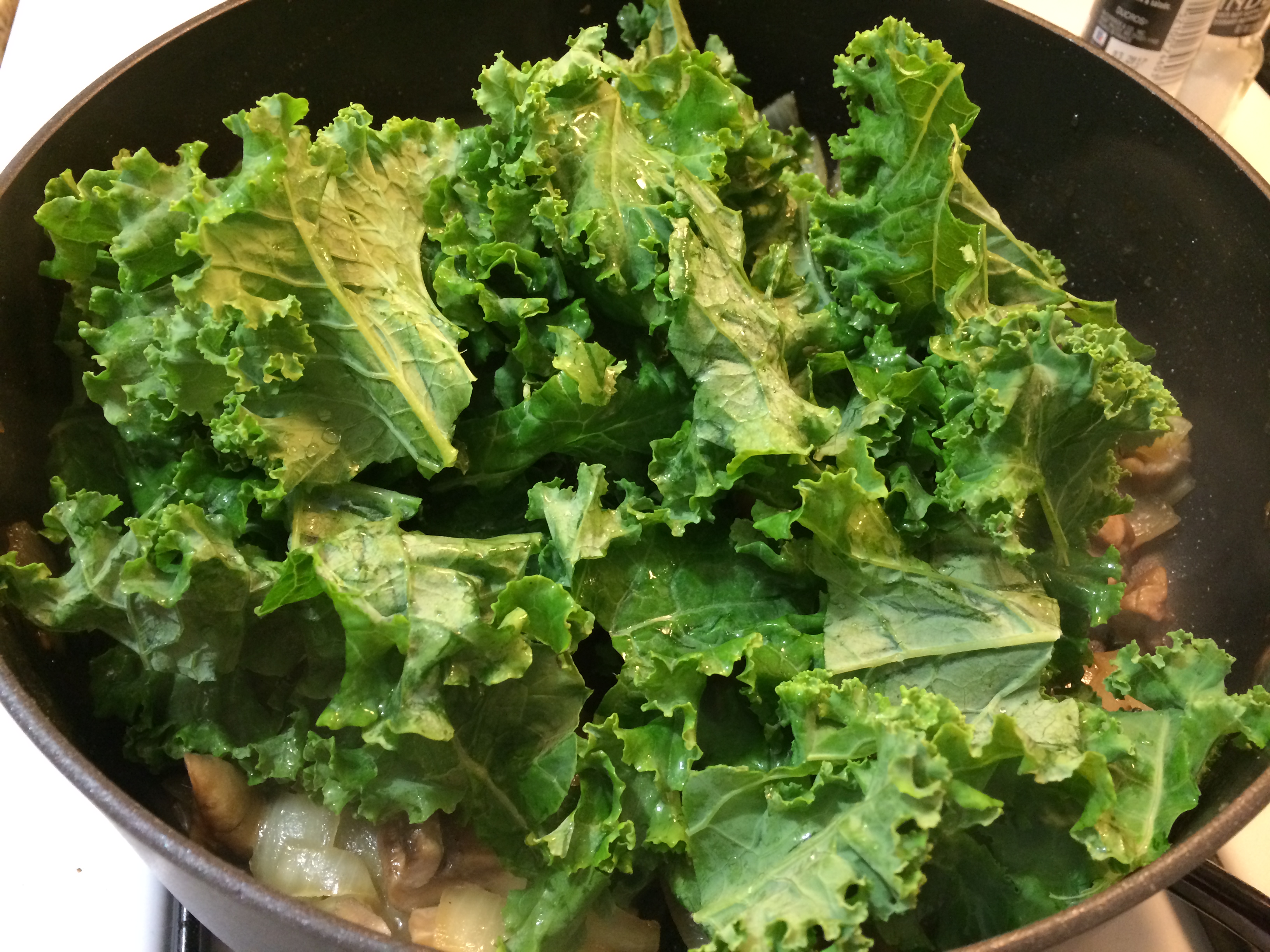 2. While the meat is cooking, chop your veggies. When the meat has finished cooking, remove it from the pan and add in your onions. I “caramelized” my onions by adding about a tablespoon of honey and a tablespoon of brown sugar, BUT, Elle, who blogs over at Nutritionella recently posted an amazing looking breakfast skillet recipe in which she caramelized onions and if you want REAL caramelized onions, follow her instructions 😉 Once the onions are mostly caramelized, add in the mushrooms. Lastly, add in the kale when the mushrooms have softened.