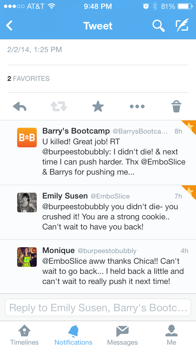 After the treadmill, we did some floor strength stuff: walking lunges, push-ups, bicep curls, deadlifts, core, and then we jumped BACK on the treadmills for 12 more minutes. It was at that time when I was like “oh hell no. this sucks,” but I pushed through it and ended strong… we ran backwards which scared the crap out of me, but I am happy to say I didn’t trip and/or fall off! #winning