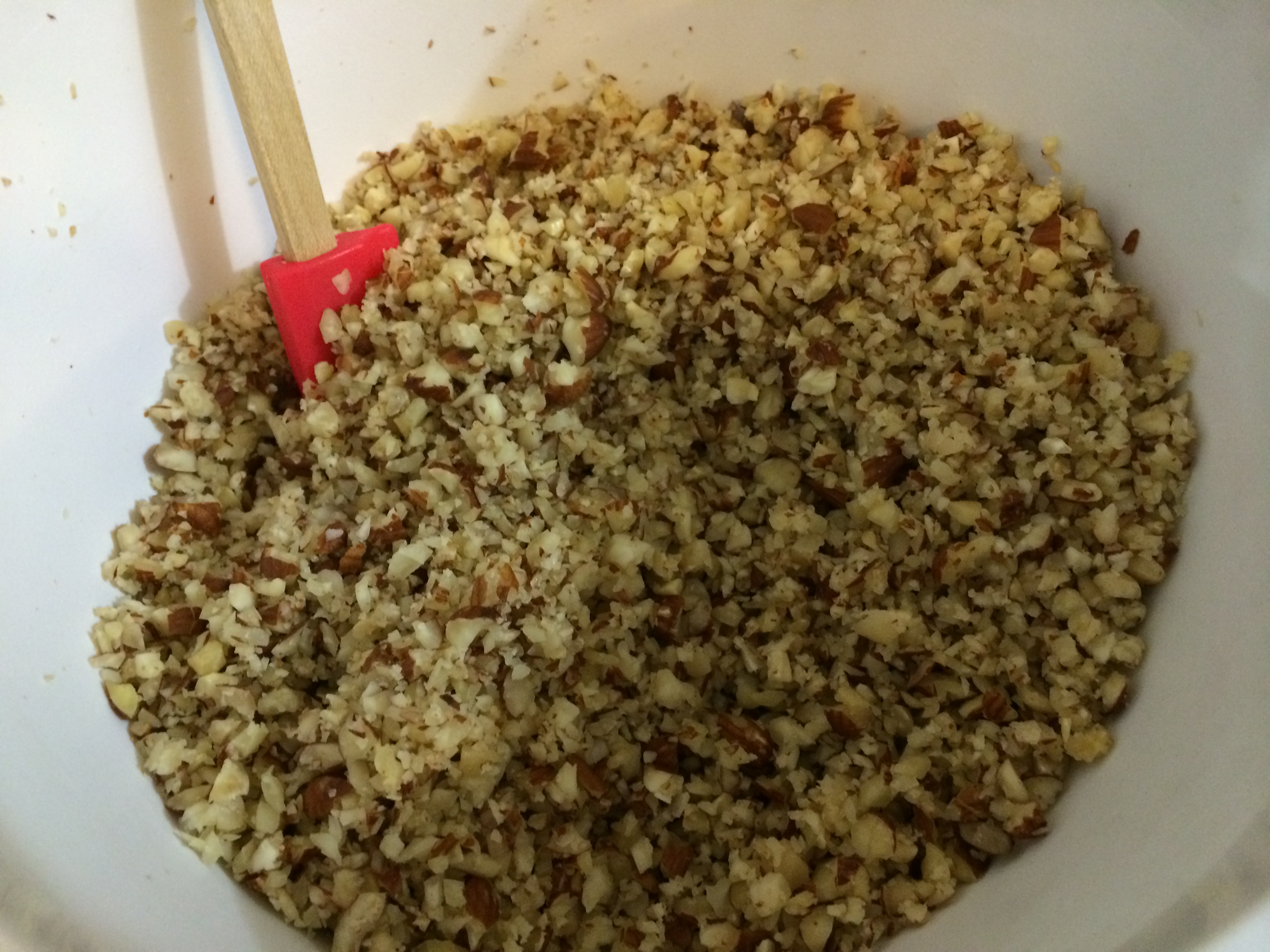 3. Heat oven to 225*. Place the nuts in a food processor or blender and process until nuts are roughly chopped.