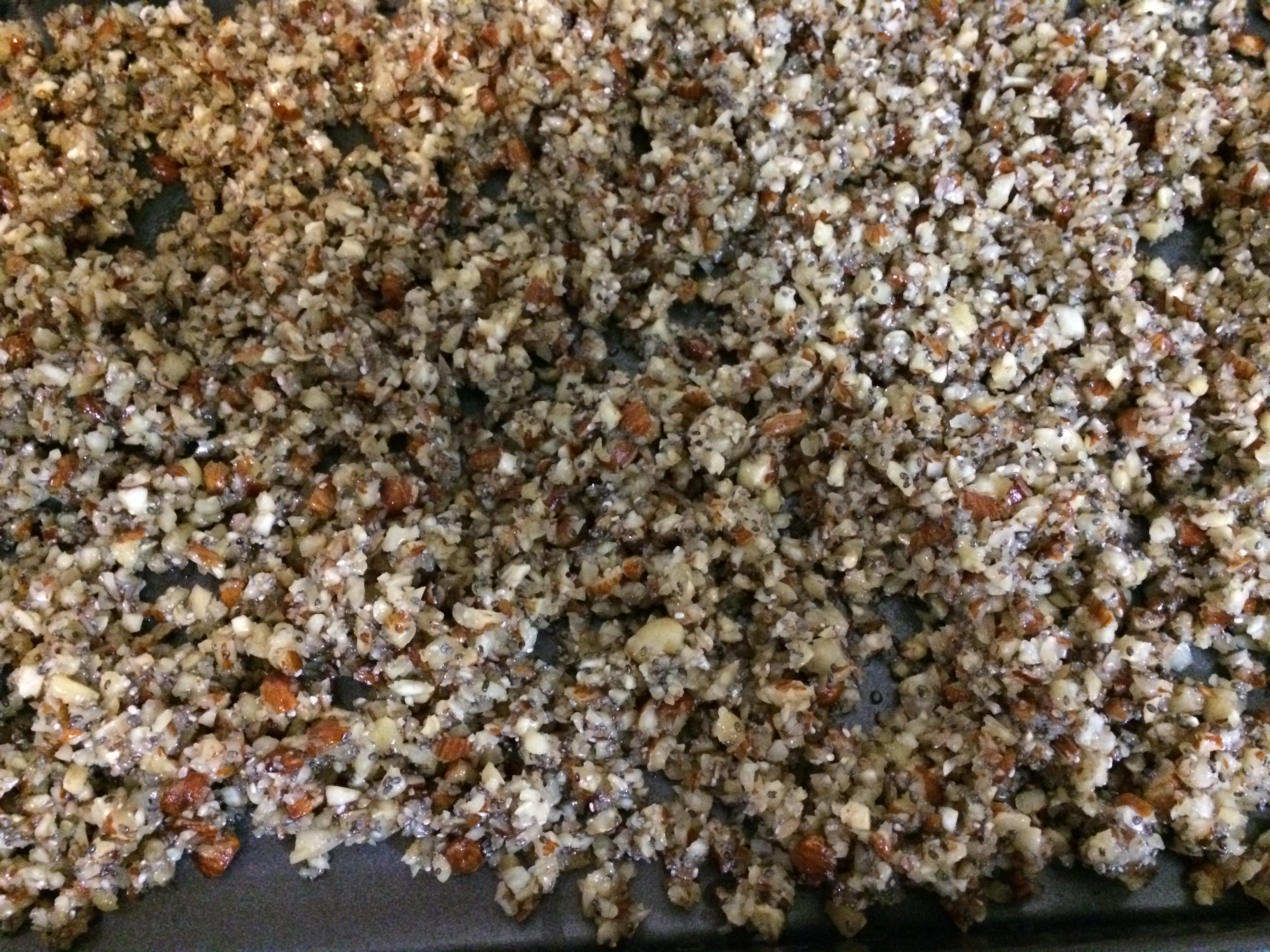 4. Combine the coconut oil, honey and vanilla and heat until the oil is melted. Add to the chopped nuts. Add in the chia seeds and coconut. The directions said to pulse these in the food processor again, but I didn’t think that was necessary as I like my granola crunchier.