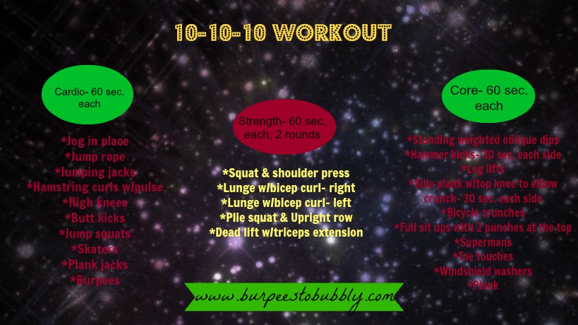 I split it up to be 10 minutes cardio, 10 minutes strength and 10 minutes core so that I could have a full body workout. It’s a little all over the place because I picked 10 different cardio and core exercises, but that’s what I needed to get me through the workout!