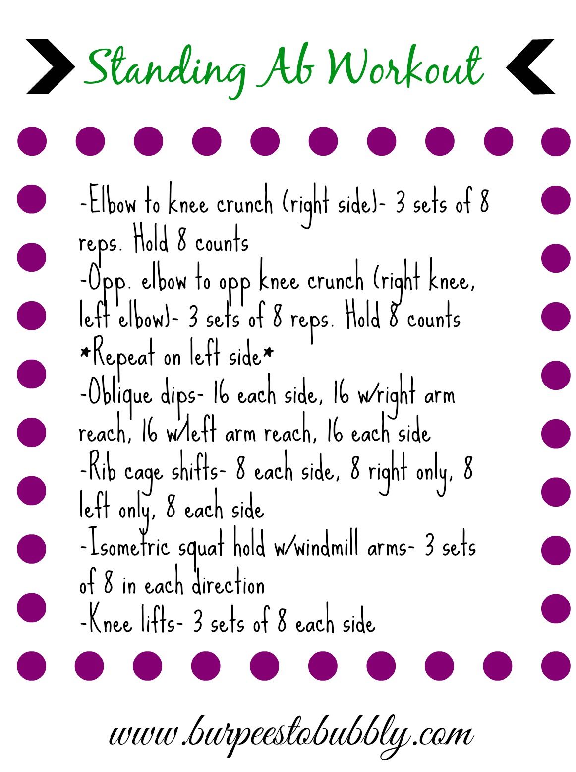 My kickboxing class on Saturday is getting so crowded that there just aren’t enough mats for everyone to use at the end for our core work time. Instead, I’ve been doing a bunch of standing ab exercises, which can be just as effective as core exercises done on the ground. This will only take you about 10 minutes to complete, which is a great way to end a workout!