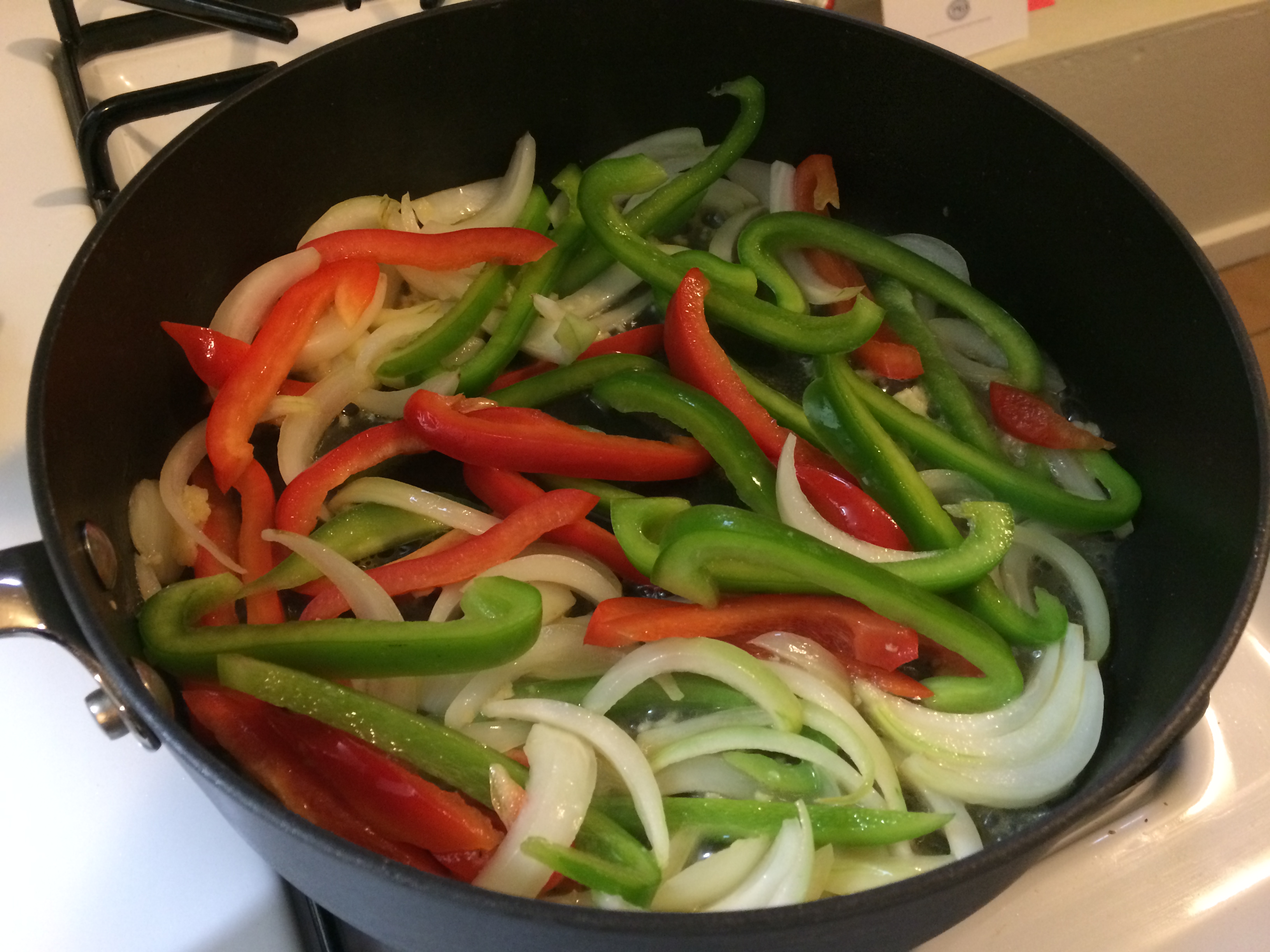 1. Cut up your peppers and onion. Heat a pan with 1-2 tbsp EVOO and add in the pepper and onion and minced garlic. Add in herbs/seasoning/wine as desired. Additionally, cook the quinoa or rice according to the package.
