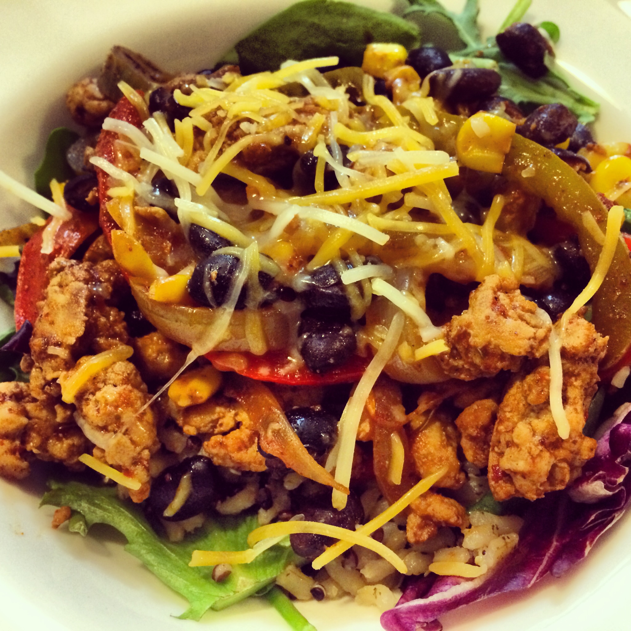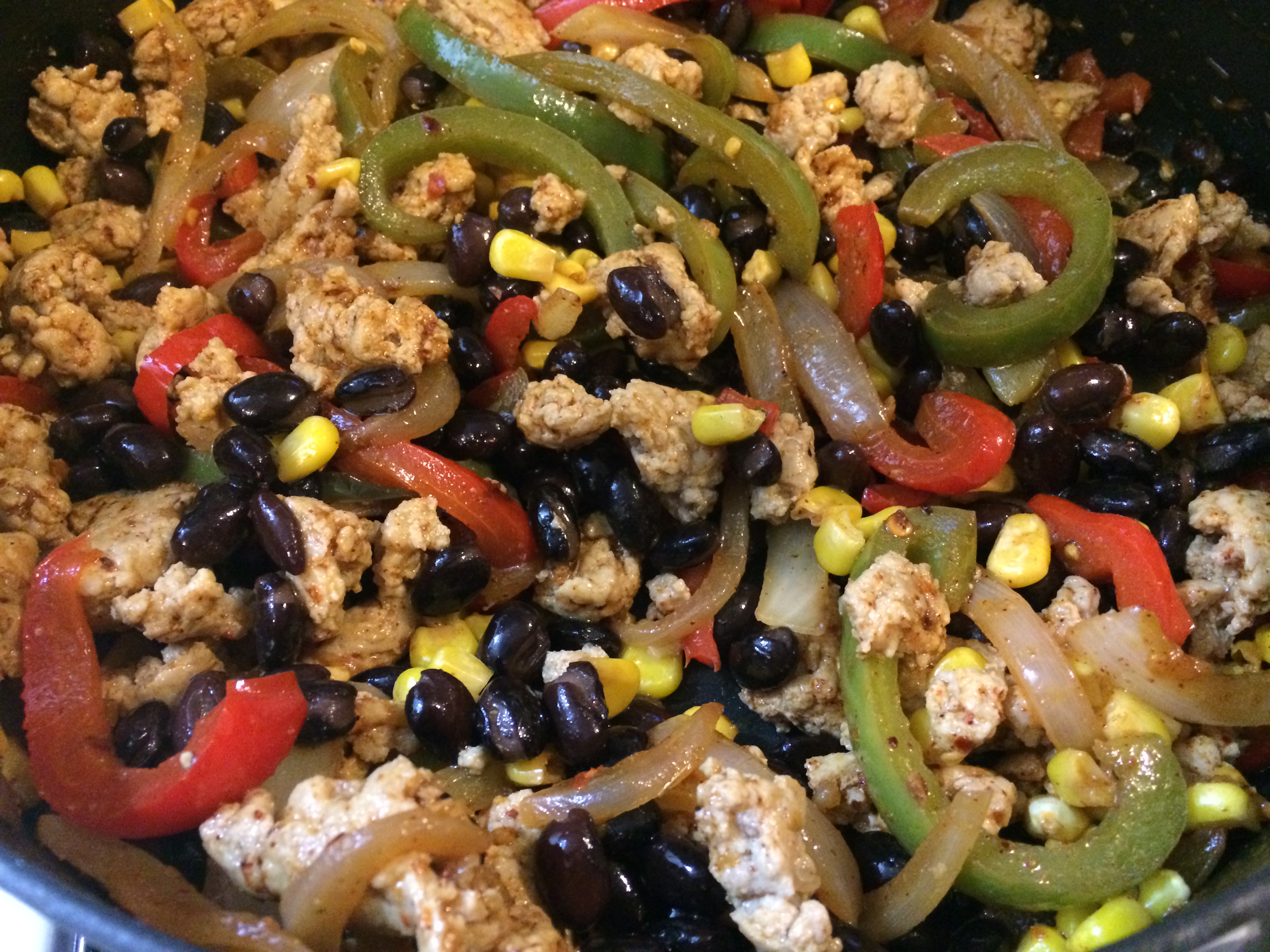 2. While the veggies are cooking, prepare the seasoning and set aside. Once the veggies are done, remove from the pan and brown the chicken. Once the chicken is almost fully browned, add in the seasoning mixture. Mix well and then add in the cooked peppers and onions, as well as the rinsed black beans and corn. Sautee until everything is warm.