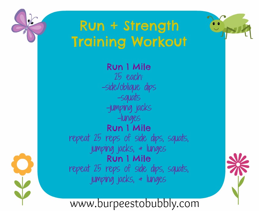 This is my favorite way to split up a run and make it seem, less… boring. I’ve done it by breaking up the run into time segments or mile segments. I’ve also added in a number of different “mini circuits” or exercises to change it up. Here are some of my favorites: