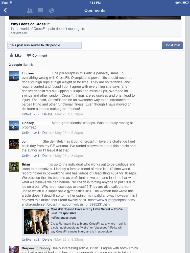 When I read through these, I found myself agreeing with them more than the ones bashing the “sport”. To me, the people bashing the workouts in the CrossFit world are less scientific and more just looking to state things to cause an uproar. To see how people feel about the various CrossFit articles surfacing as of late, I brought the discussion to my Facebook page and a few people had some really good thoughts and comments in regards to the article that was posted.