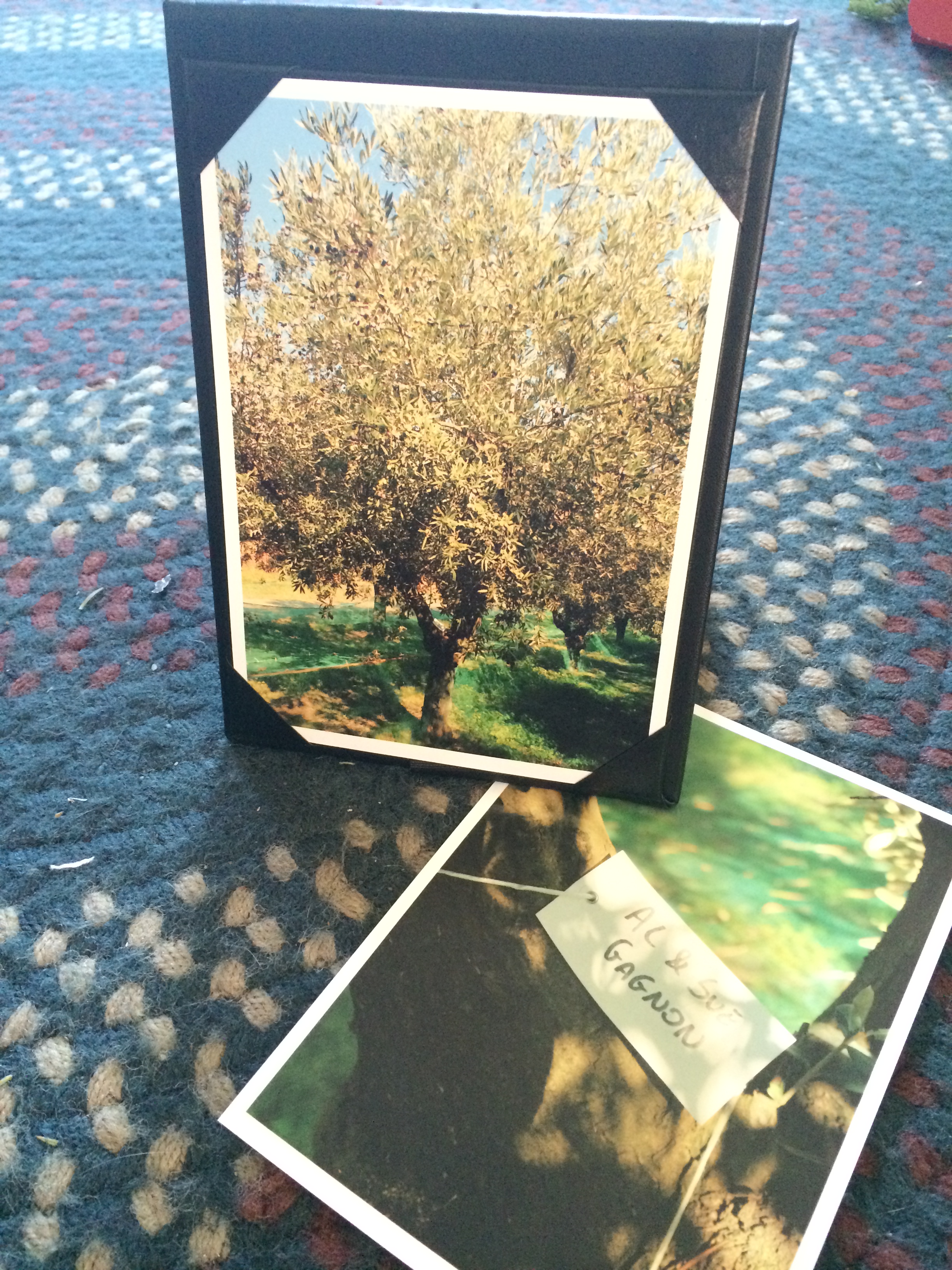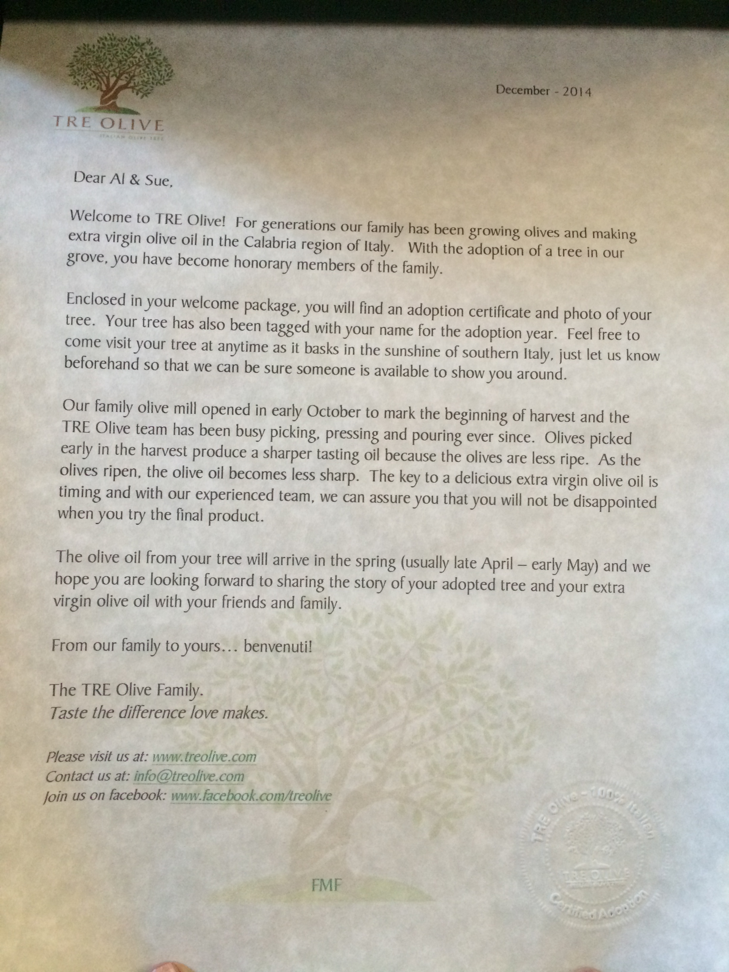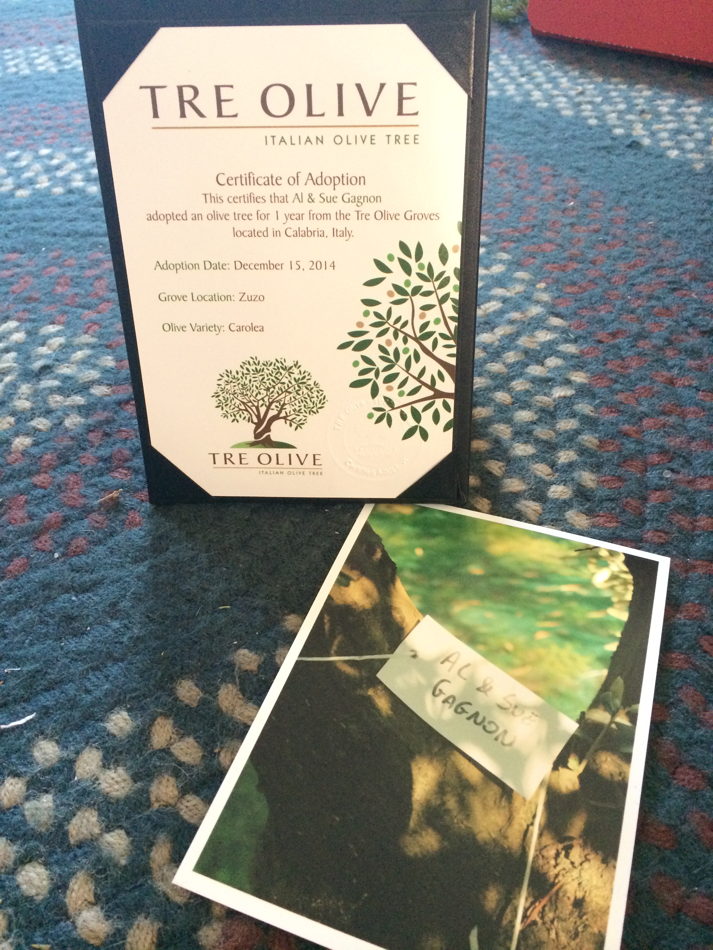RM opted to “up” the package and receive 2 tins of olive oil with the adoption certificate and pictures, which was great for “instant gratification” people like myself 😉 I was SO impressed with how classy and special the package from Tre Olives was- everything was so thoughtful! The certificate, letter, map, picture of the tree- especially with my parents name on it- made it all so personal and meaningful. It showed you that you really have an adopted tree in Italy… how cool is that?!