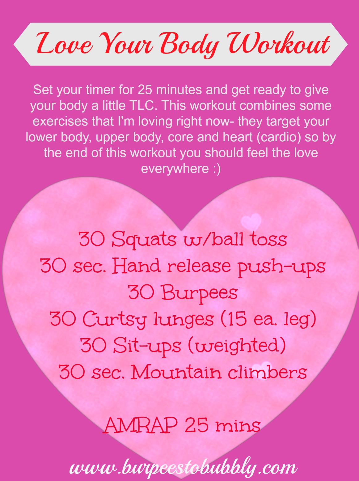 I’d love to see your #sweatyselfies if you try this workout! If you do, be sure to tag me @Burpeestobubbly or use the hashtag #B2Bloveyourbody. Take time this month to give yourself a little love- you deserve it… I promise!