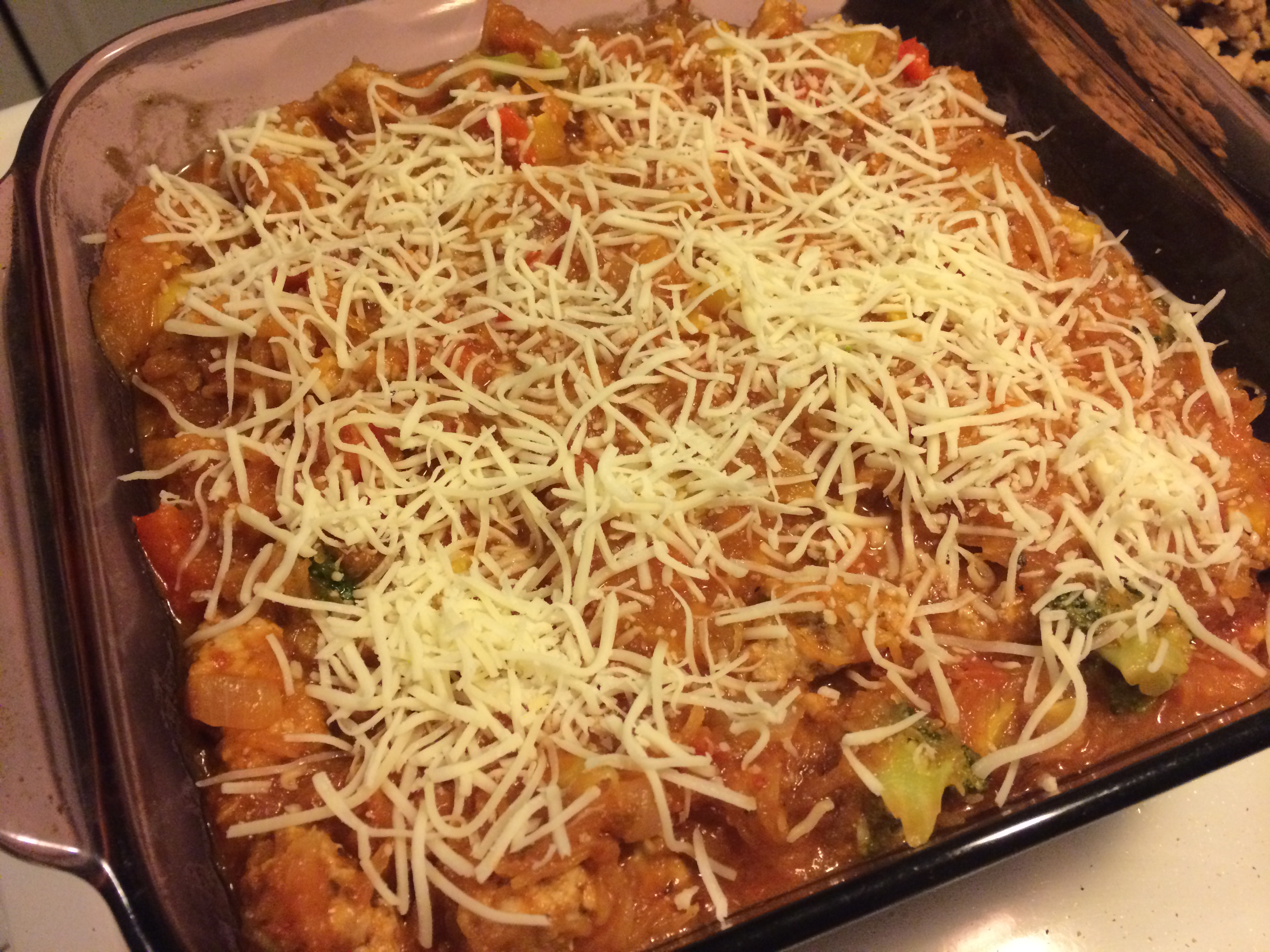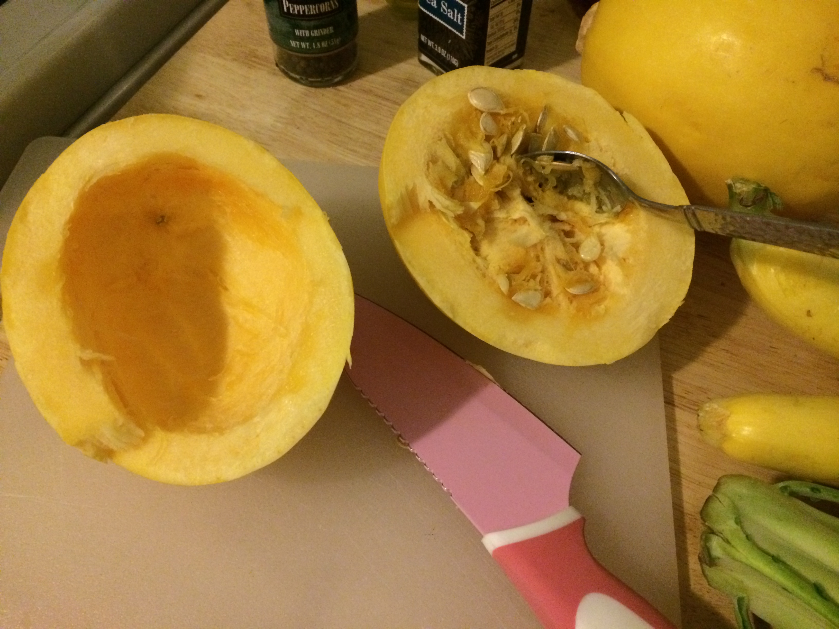 A long time ago, I posted this Spaghetti Squash Casserole recipe, which was a big hit, so I figured a slight variation on it would turn out as good. Luckily for us, it did! I think I actually liked it better, but the jury is still out on that one.