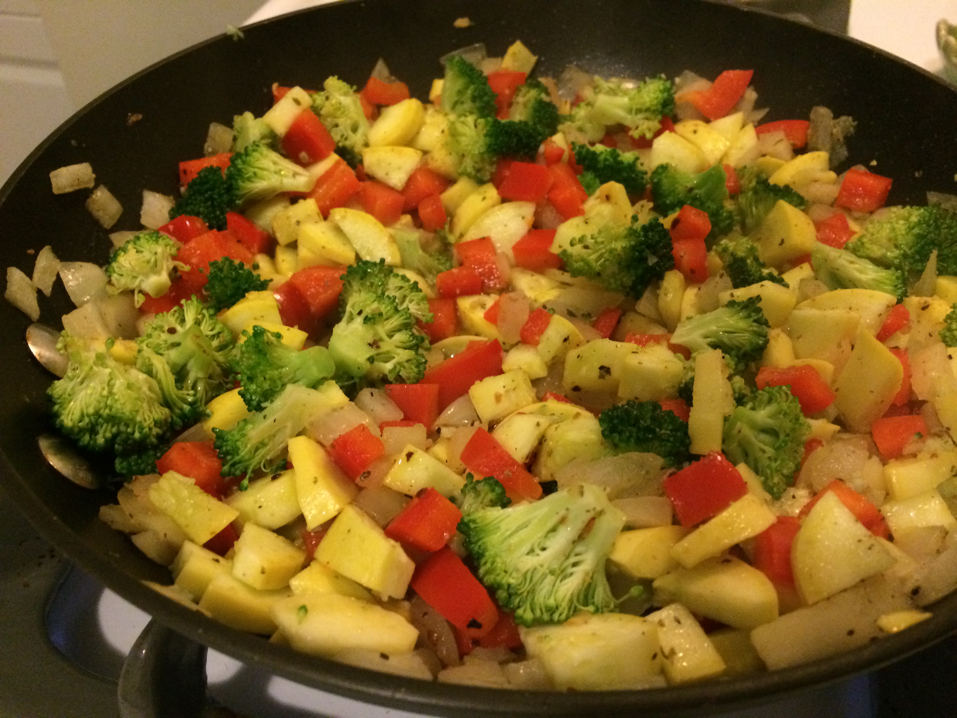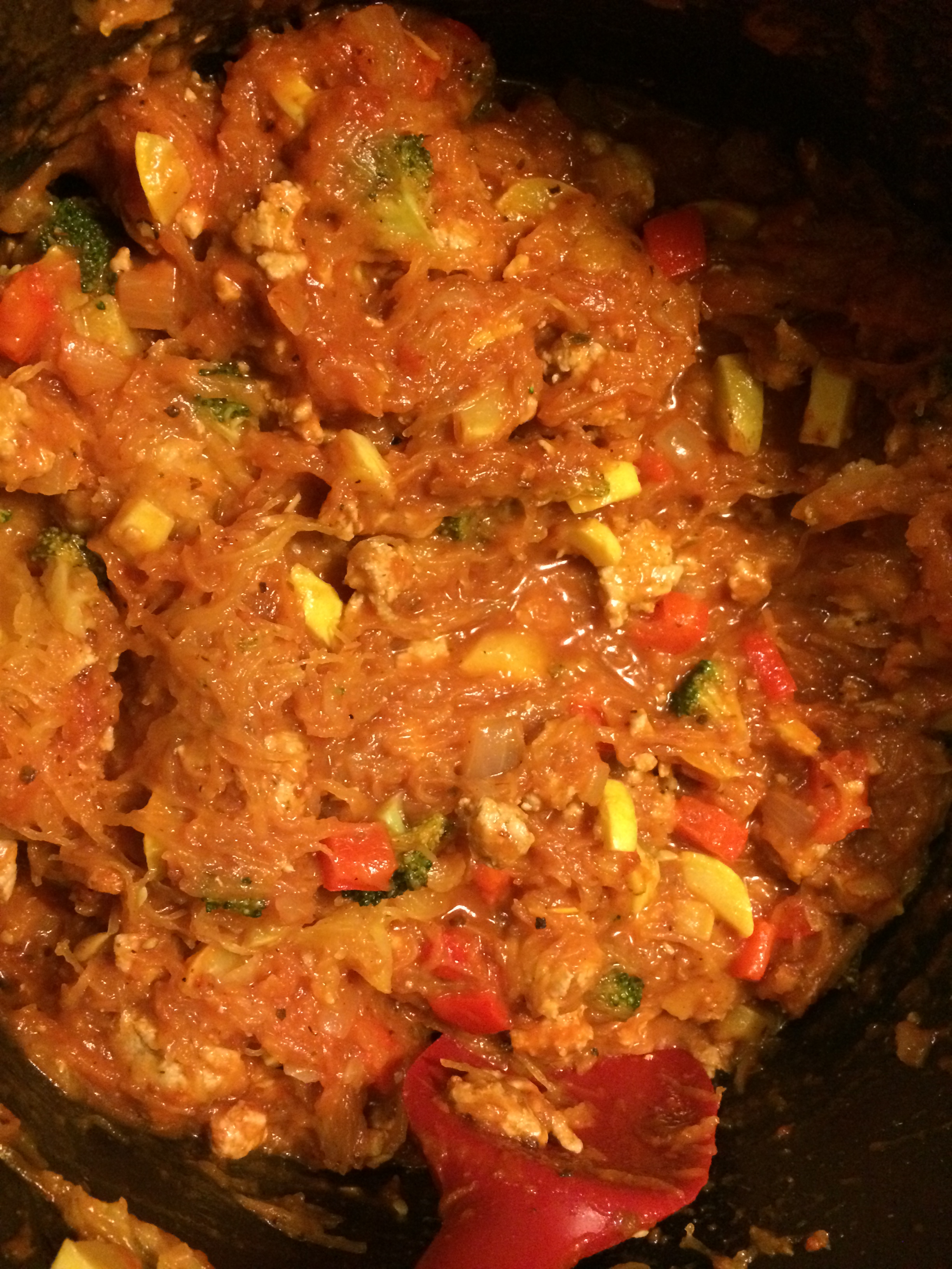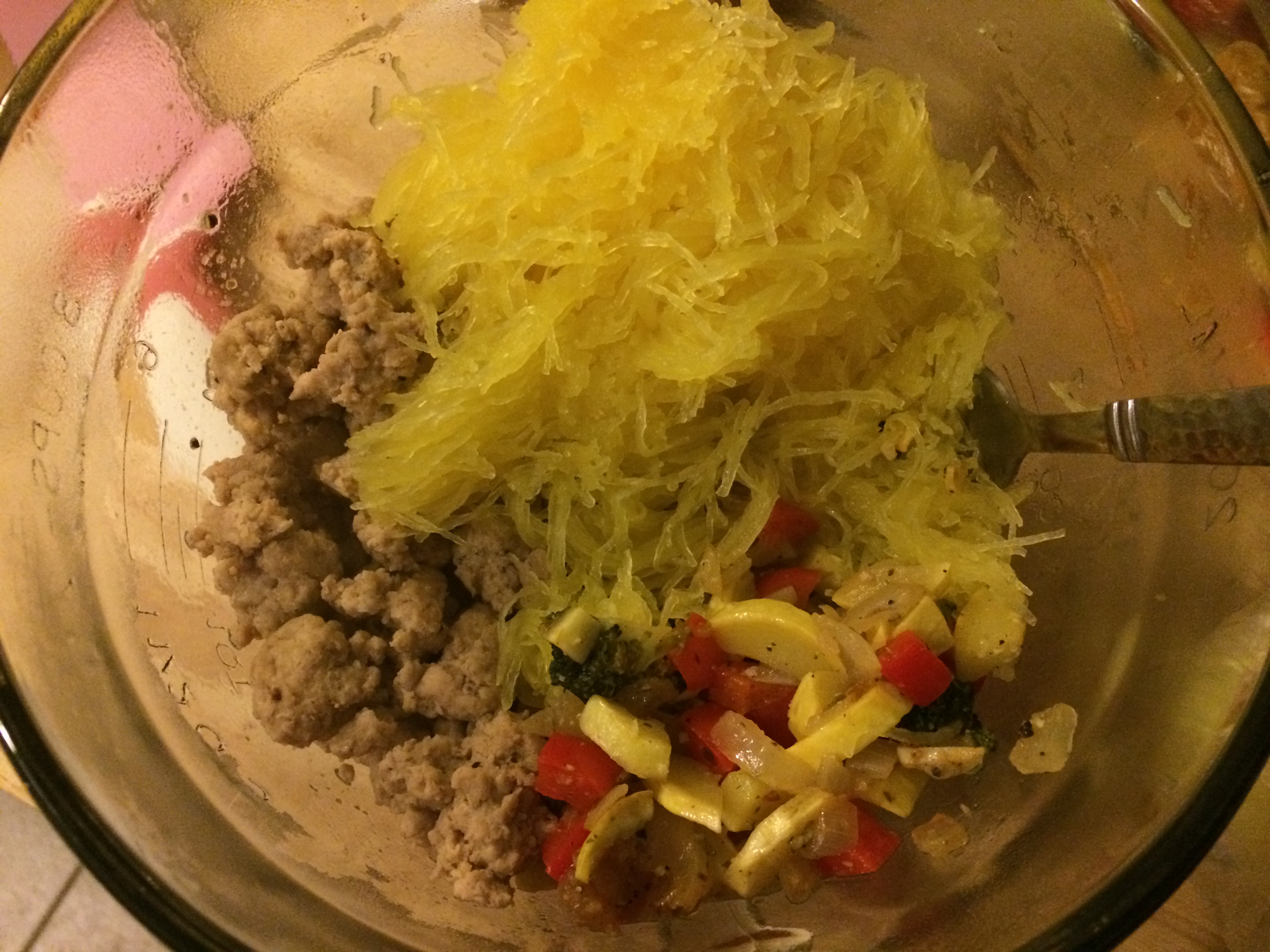 2. While the spaghetti squash is cooking, preheat the oven to 350* , chop your veggies and sautee over medium heat until they are cooked (but not over cooked!).
