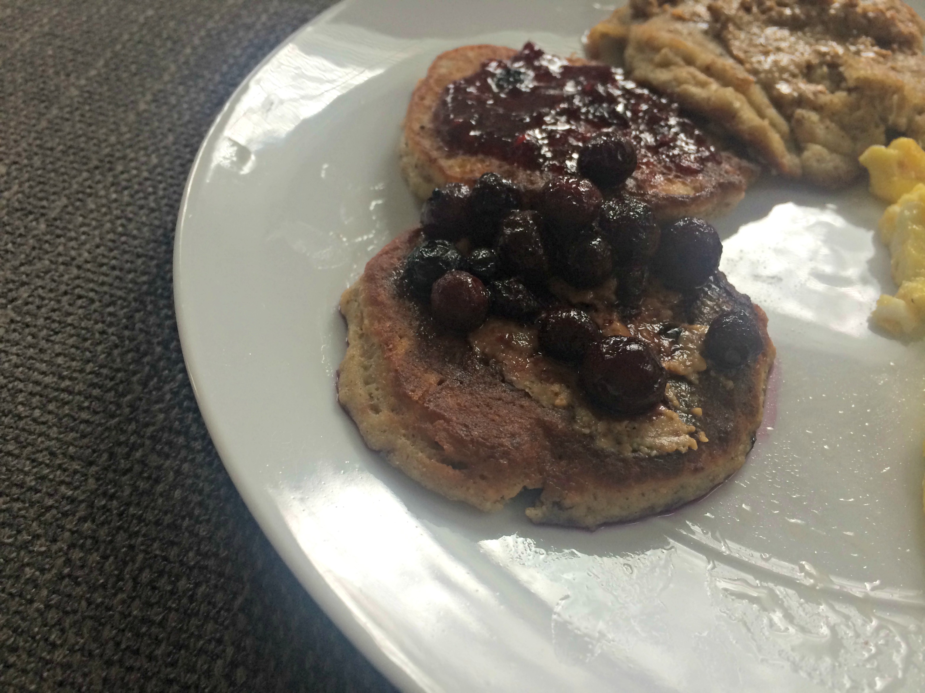 I will say that these are not light, fluffy, sweet pancakes. They are, however, chock full of good ingredients and can be modified to add some sweetness if you’d like. We didn’t have any maple syrup, so I got creative and put some of my mom’s homemade jam, almond butter and then I tried some of the blueberry reduction that RM made. I have to say, the blueberry reduction with a little honey was a winning combination π