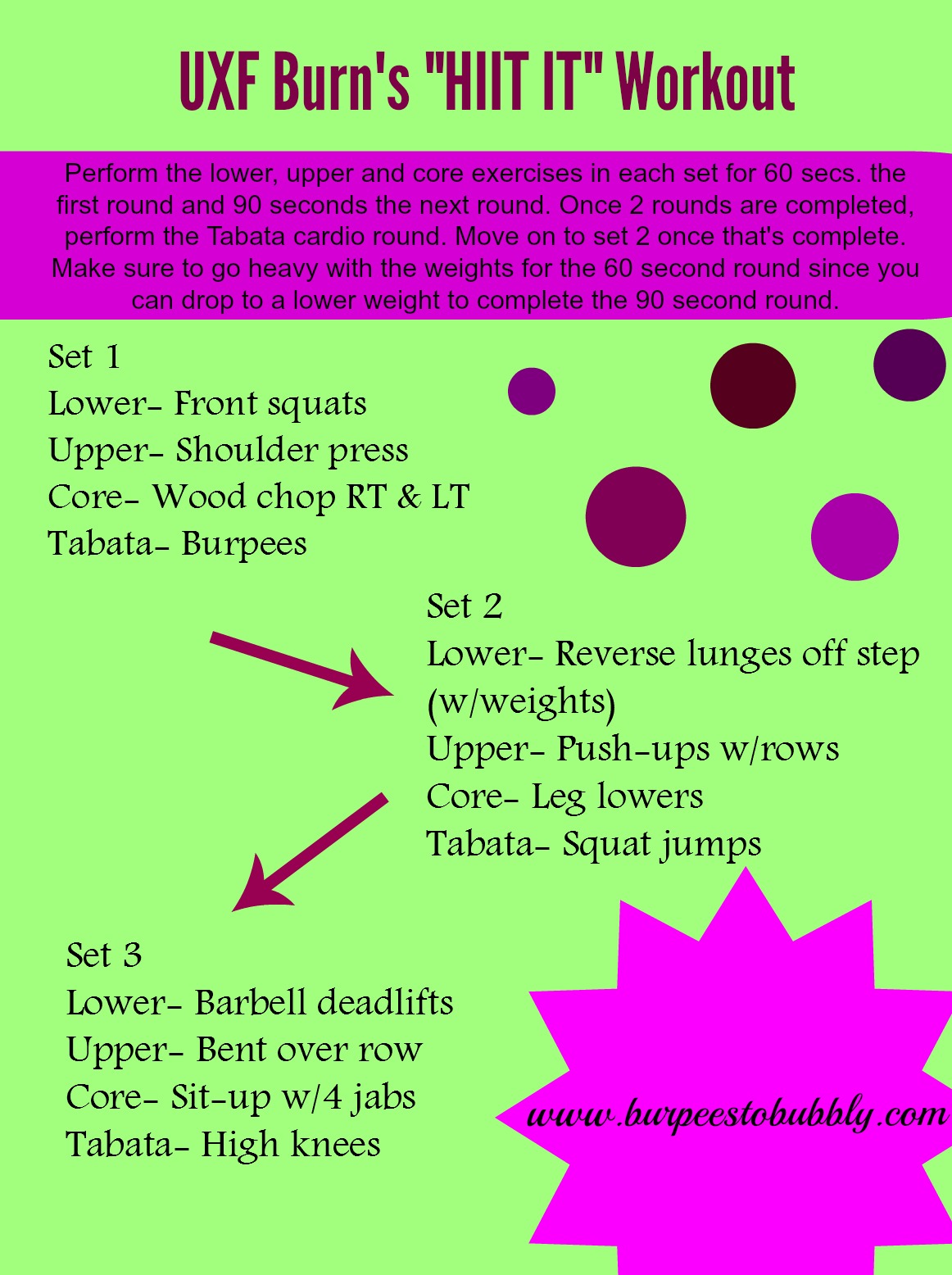 And for the workout- I’ve posted a number of UXF inspired workouts on the blog since those workouts always kick everyone’s butts! Unfortunately, I can’t really take credit for the format, although I’ve slowly adapted the format to fit my style of teaching and workout (shhh don’t tell anyone 😉 ). But, that doesn’t change the fact that these workouts are TOUGH! The newest format released- HIIT It- is no different. This workout incorporates heavy lifting, lower, upper and core focused exercises in each set and a tabata cardio round to finish it off.