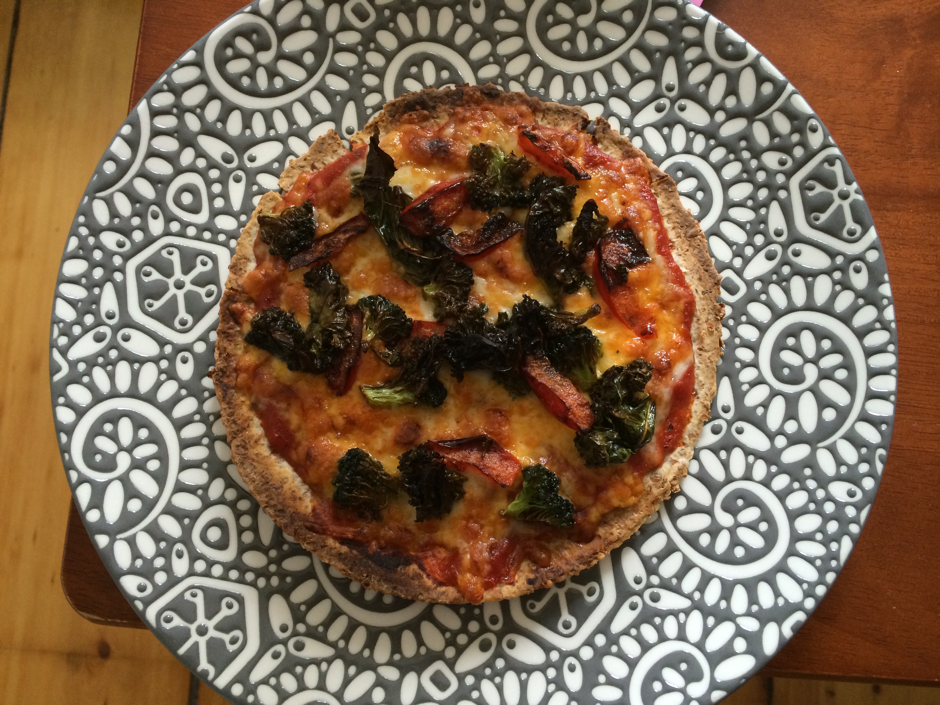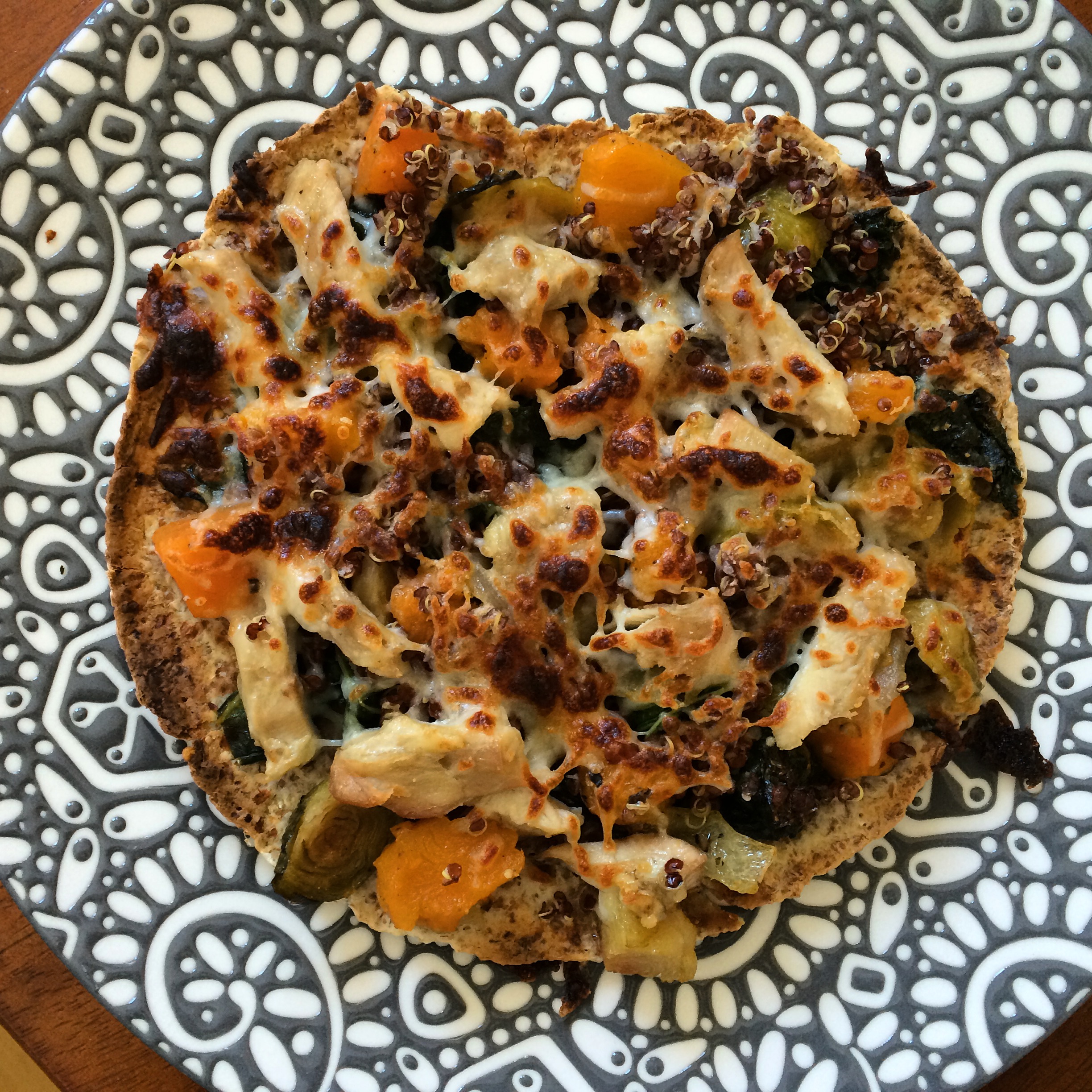 Oh my goodness. These Ezekiel wrap “pizzas” I’ve been making have been awesome. I just take the wrap out of the freezer, top it with whatever I’ve got in my fridge and broil it until the cheese is crispy. It’s the perfect lunch!