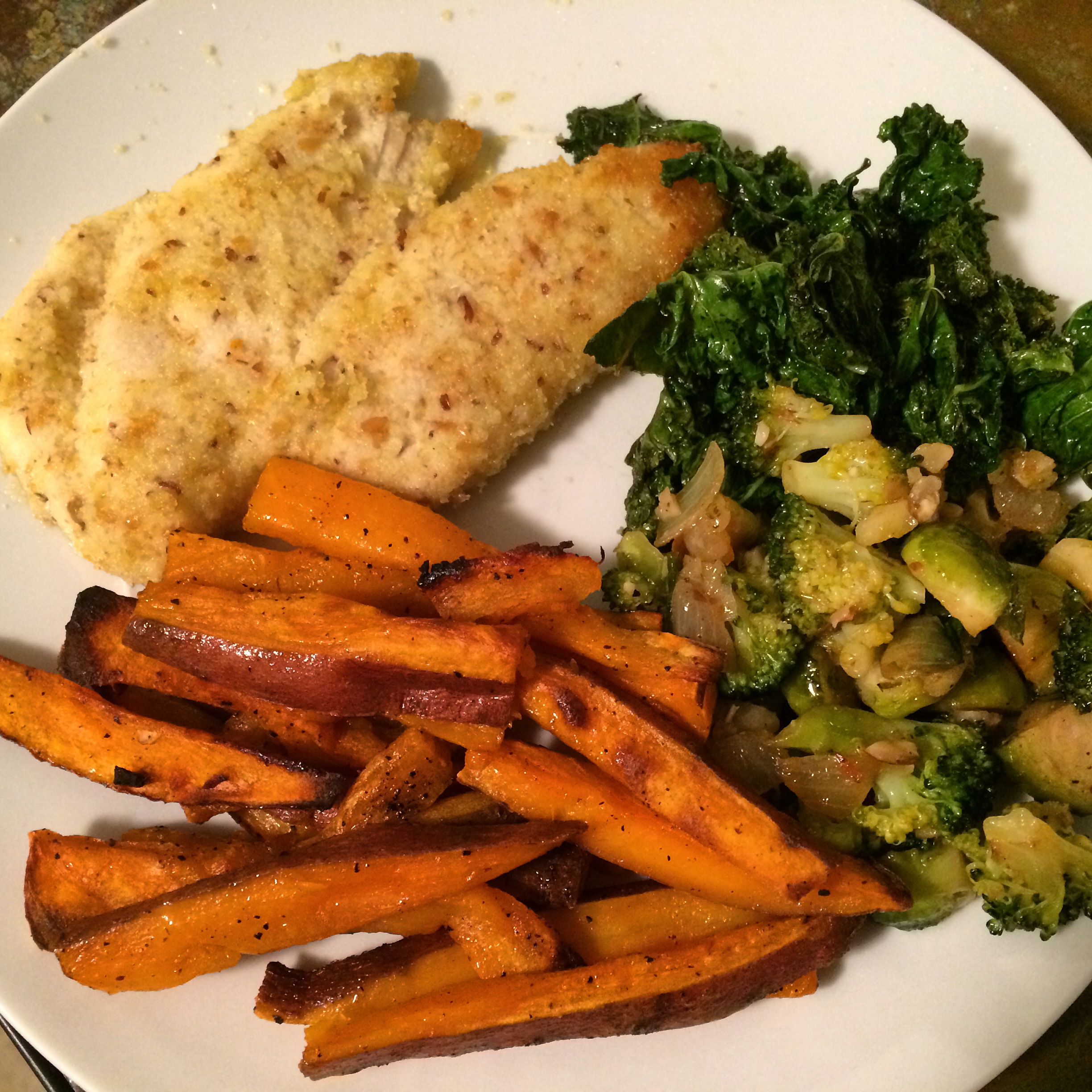 Our healthy 5 year old kid meal: Chicken “tenders”, sweet potato “fries”, kale and Brussels Sprouts w/Broccoli, Onions & Slivered Almonds